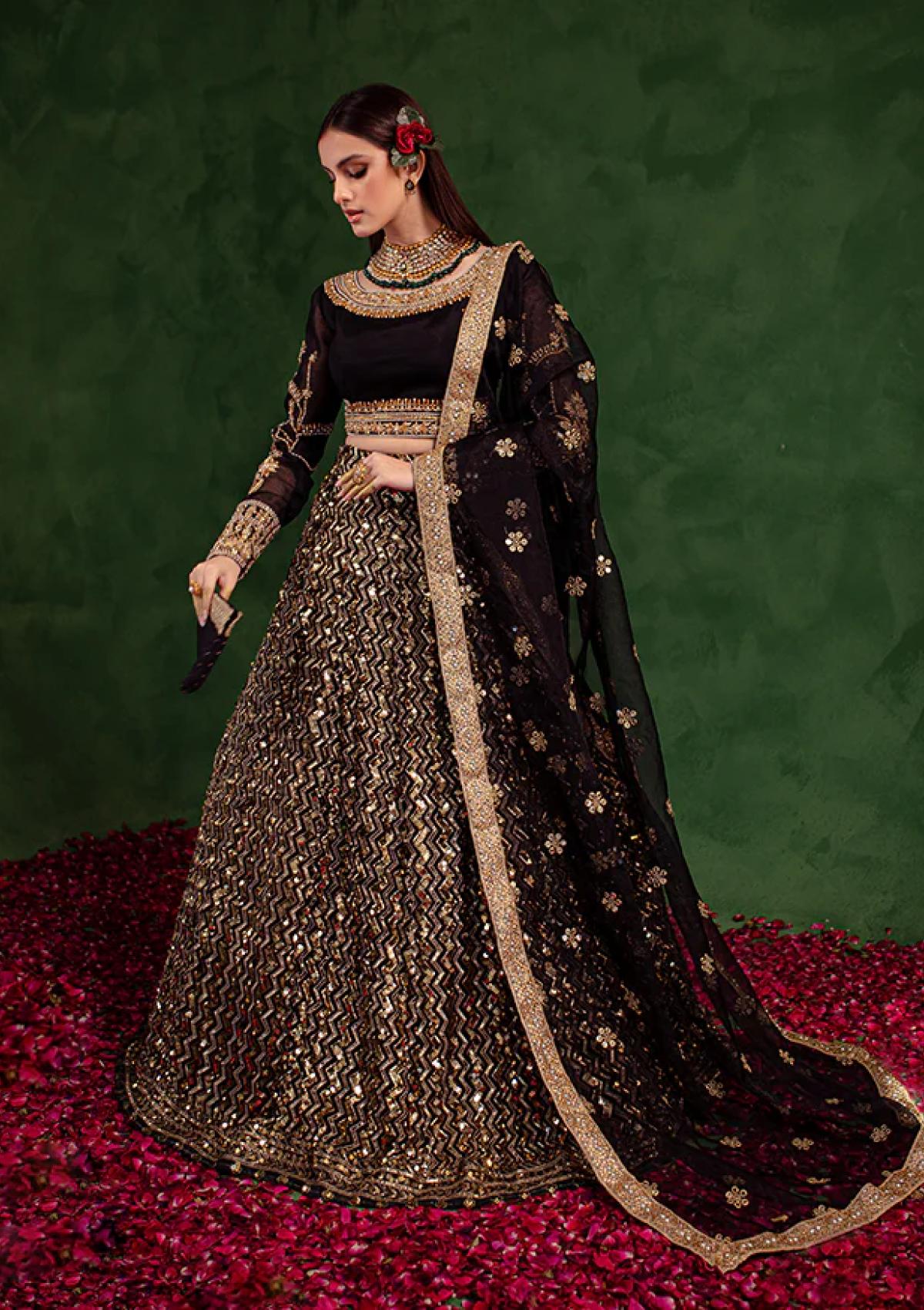 Nothing compares to the beauty of a black dress. Raqs comprises a Korean silk blouse heavily embellished with baitki, dabka, swarovski, and sequins paired with a lehenga that has a chiffon base and is adorned with tilla work and sequins. Golden embellishments on the black organza dupatta enhance the beauty of this luxury formal.