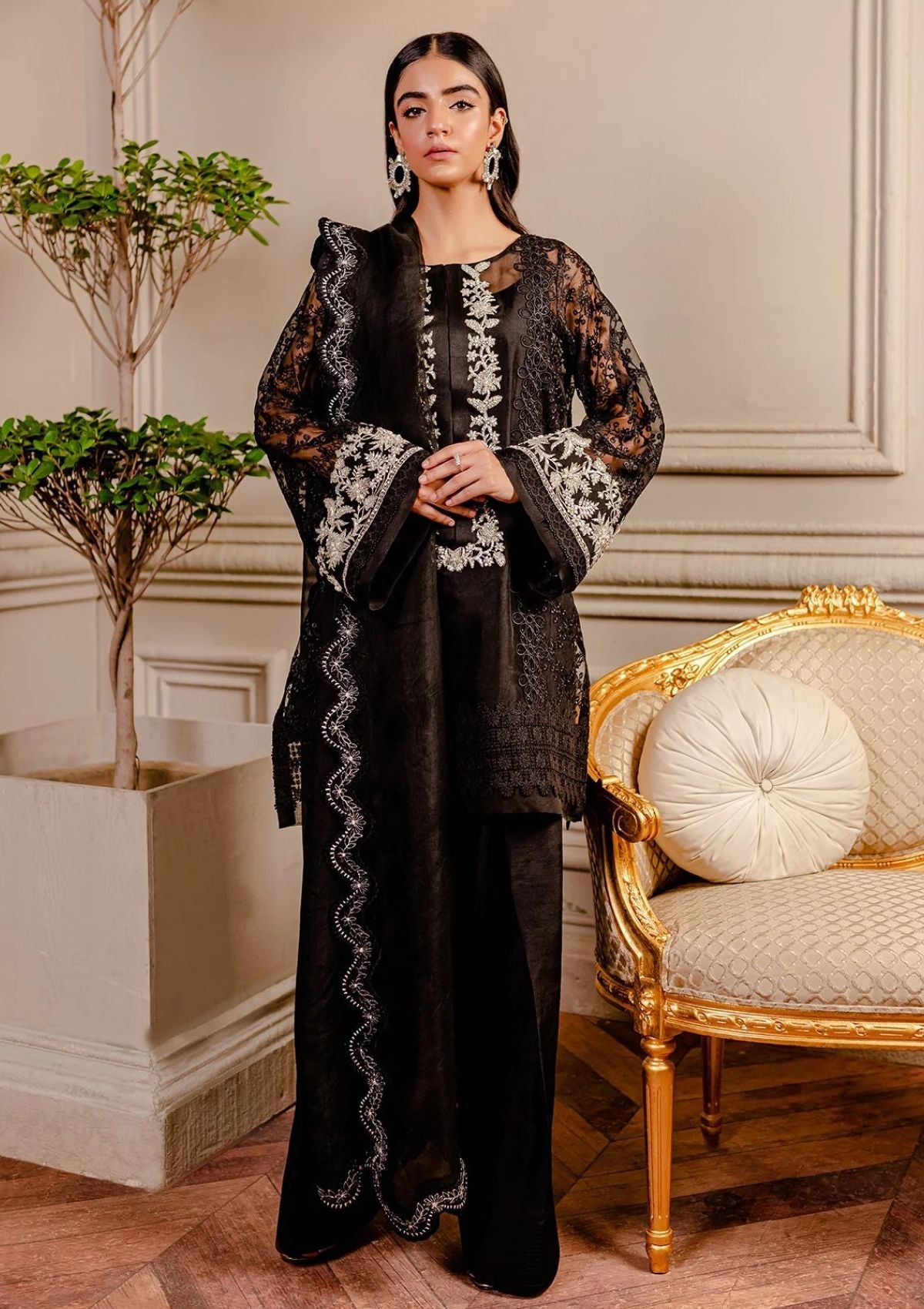 Raven, incorporates heavenly embroidered compositions on organza, rendered in black. The neckline and sleeves stand out with contrasting embroidery further enhanced with hand embellishments. The shirt and sleeves are finished with laces. The ensemble's look is completed with a marvelous organza dupatta with scalloped borders and a Korean Silksalwar.