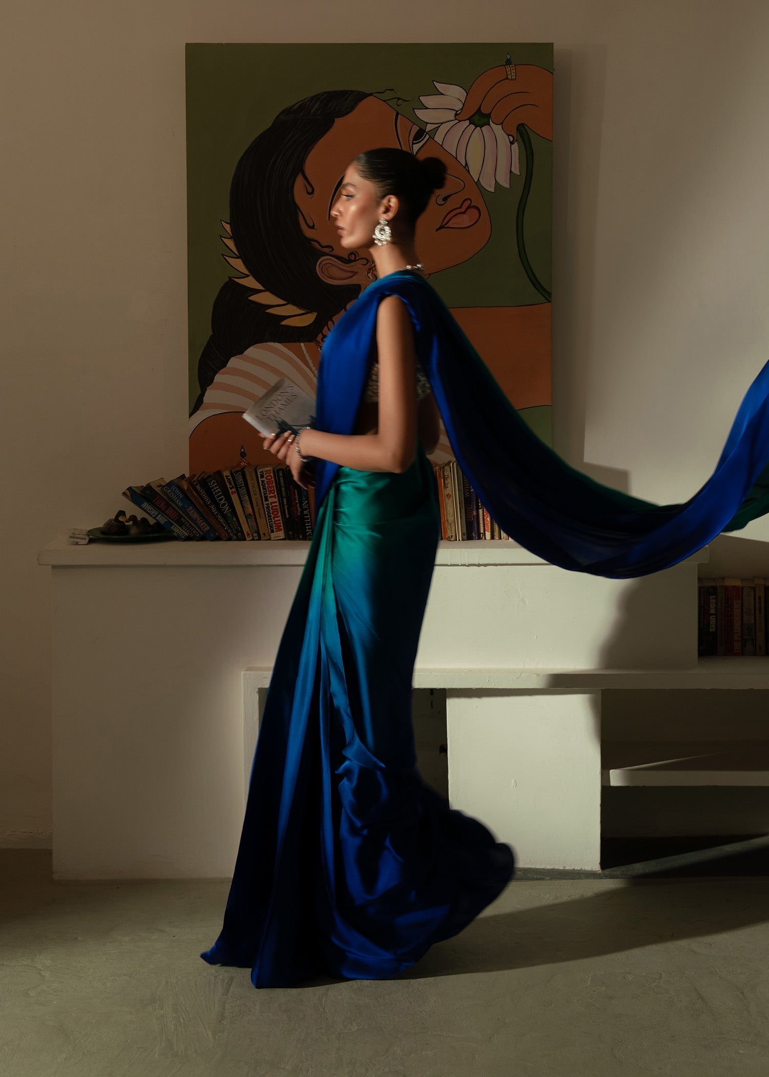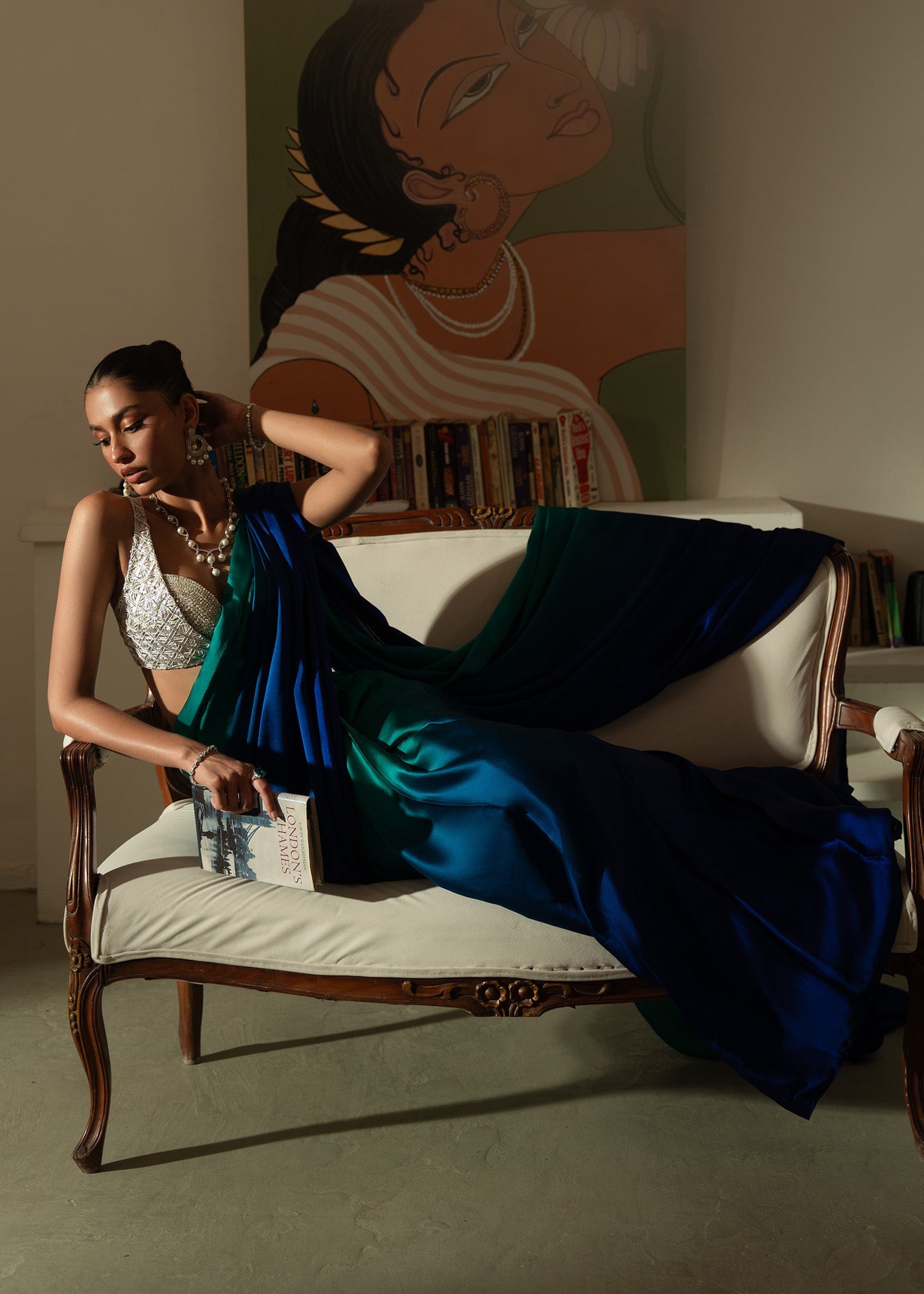 Get the temperature soaring in this Uber glam dip dyed charmeuse silk saree that takes inspiration from the shades of a gorgeous peacock!ÃÂ Comes with a hand crafted blouse that has been made using a hand woven gota fabric. Layered in style with a crystal peekaboo insert.