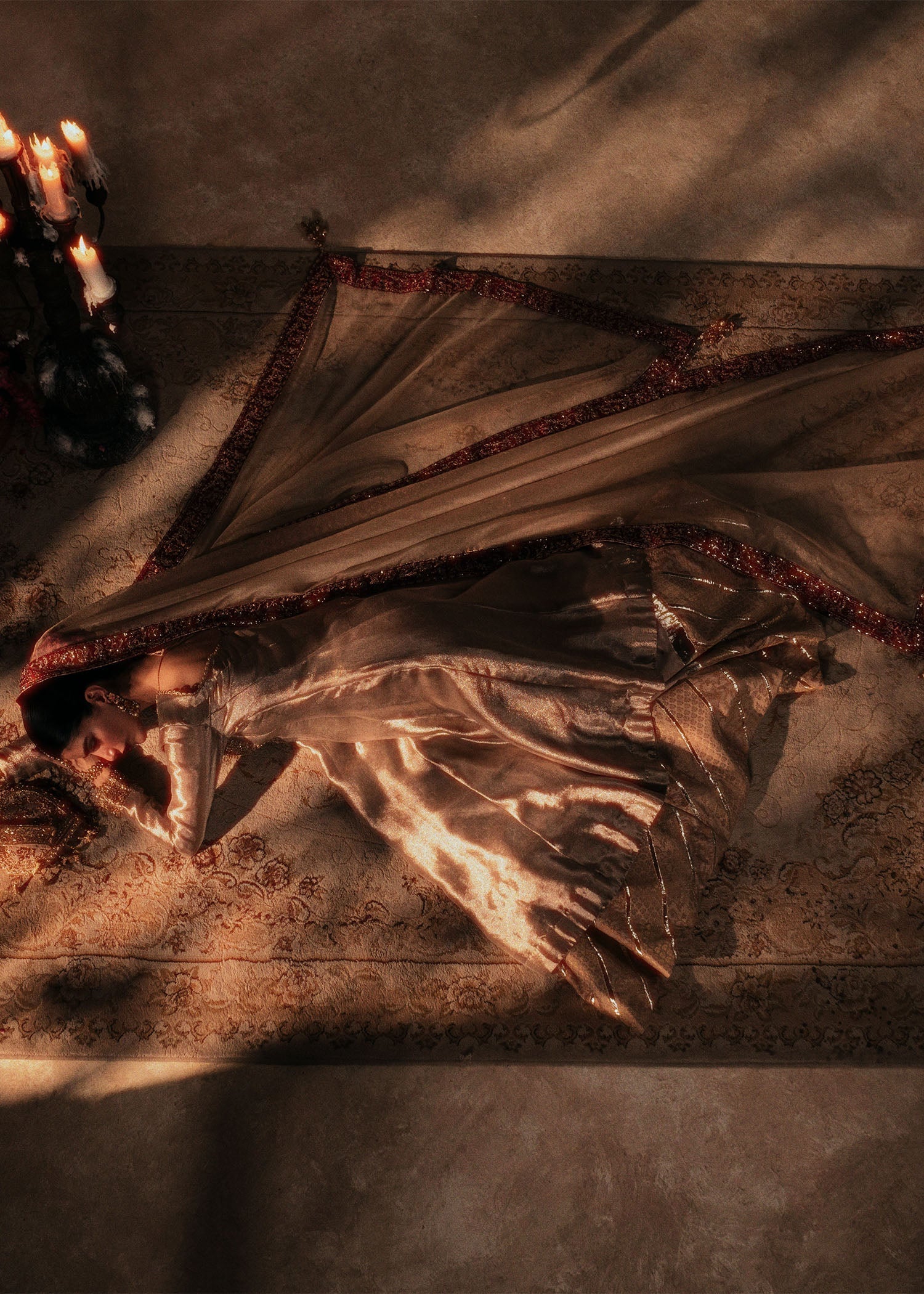 Offering elevated ease and sophistication, this gold tissue panelled peshwas features a heavily worked neckline and a classic chatta patti brocade sharara. Completing the festive look with a gold pure net dupatta framed with a red charmeuse silk border, you can totally style this for an intimate nikkah or bookmark it for the trousseau.