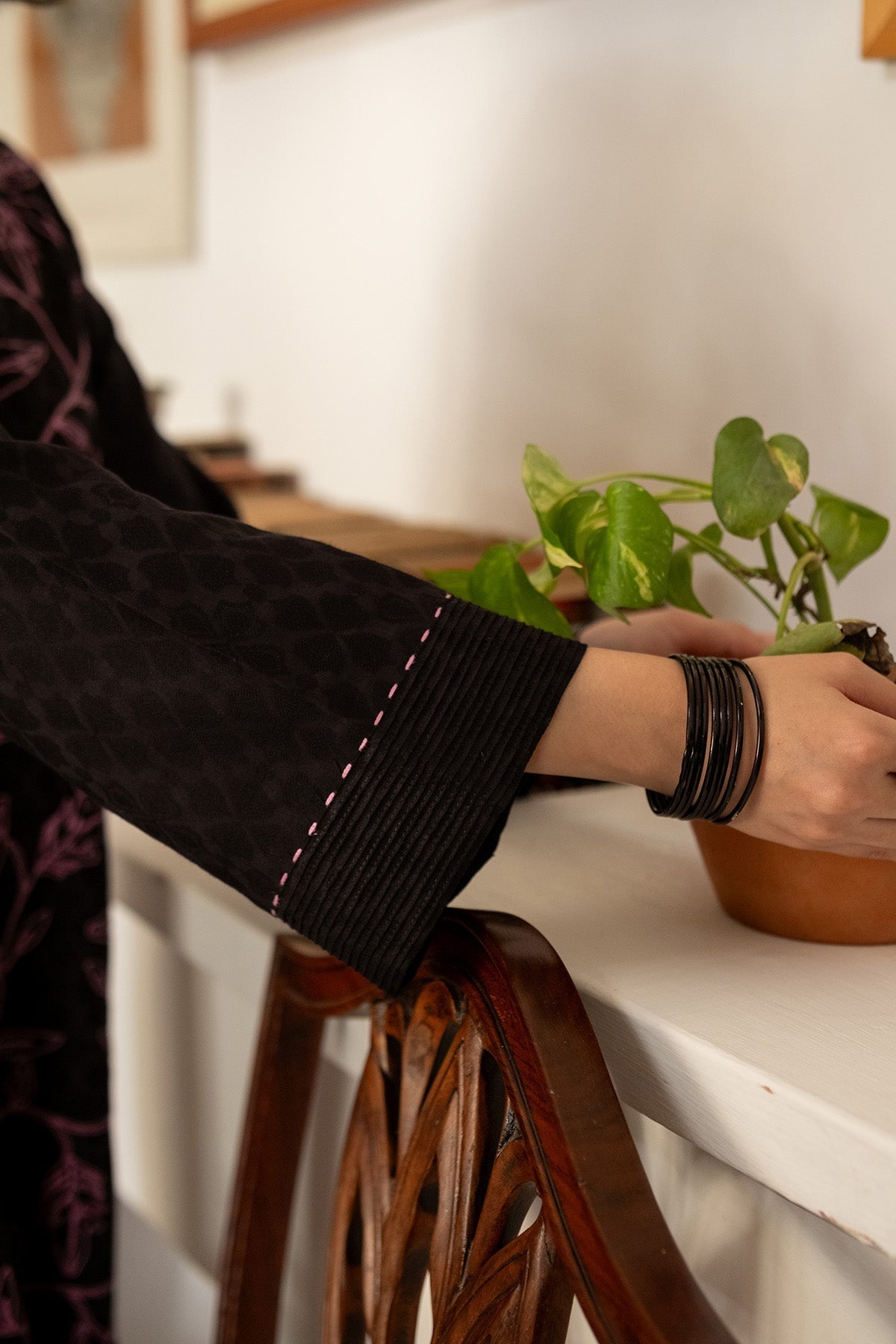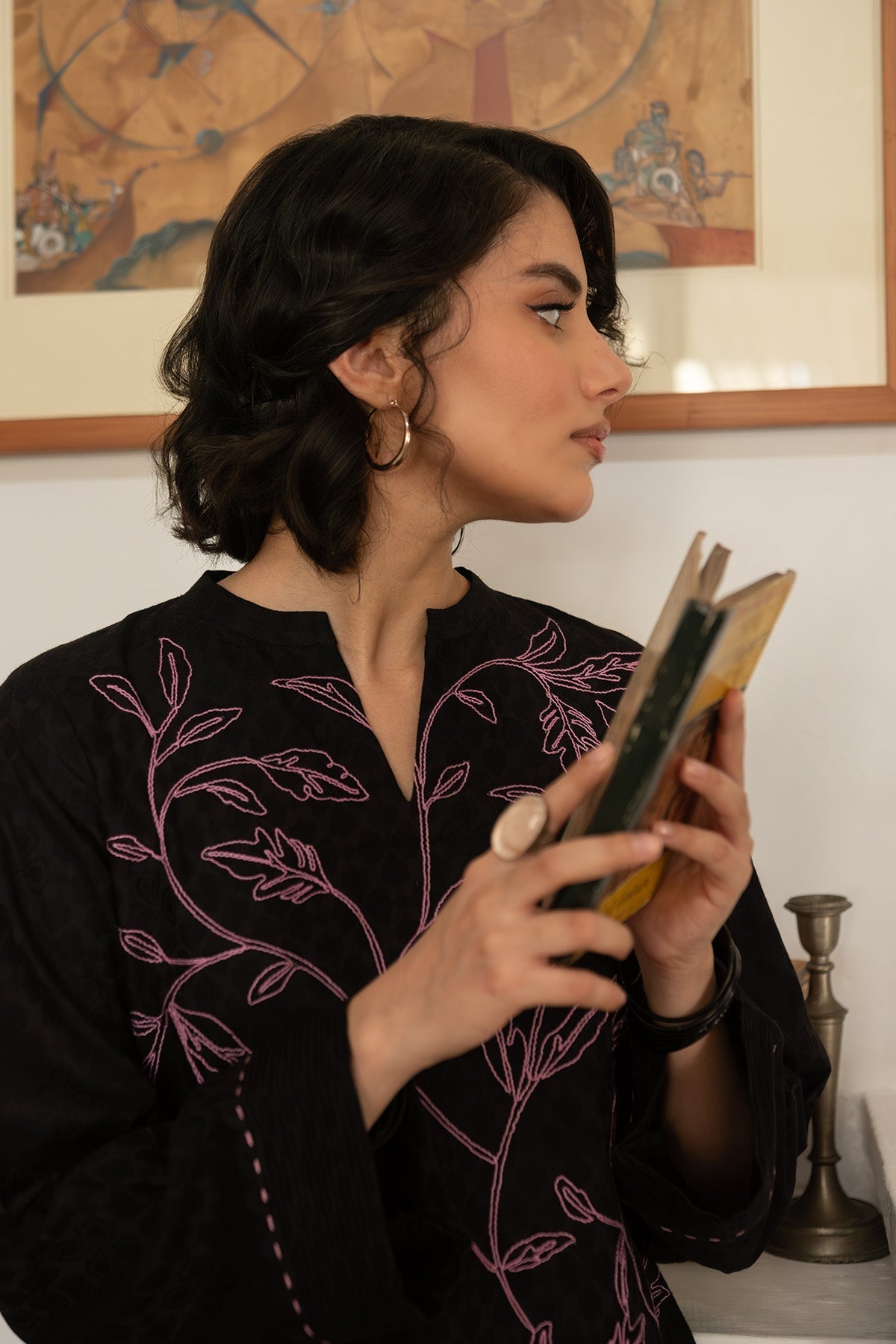 This Black Co-Ord Set Is Adorned With Linear Botanical Embroidery And Pintex Details On Sleeves, Paired With Straight Trousers.