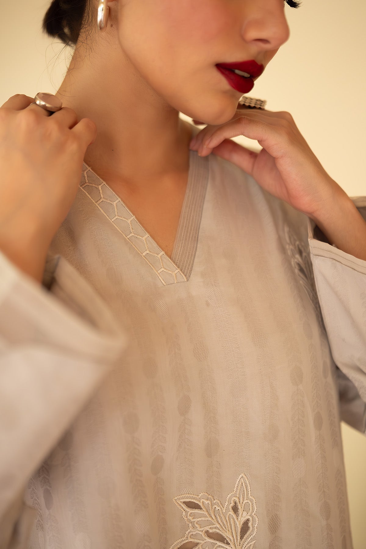 LightÃÂ Grey Jacquard Co-Ord Set With A V-Neckline Enhanced With Intricate Cutwork Embroidery, Paired With Matching Trousers.