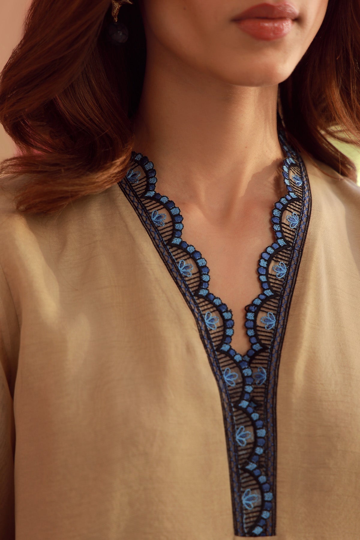 A chic semi-formal pret ensemble perfect for eid, featuring a short length organza shirt with heavily embroidered sleeves, intricate scalloped neckline with contrasting embroidery, paired with an embroidered organza dupatta and raw silk embroidered pants.