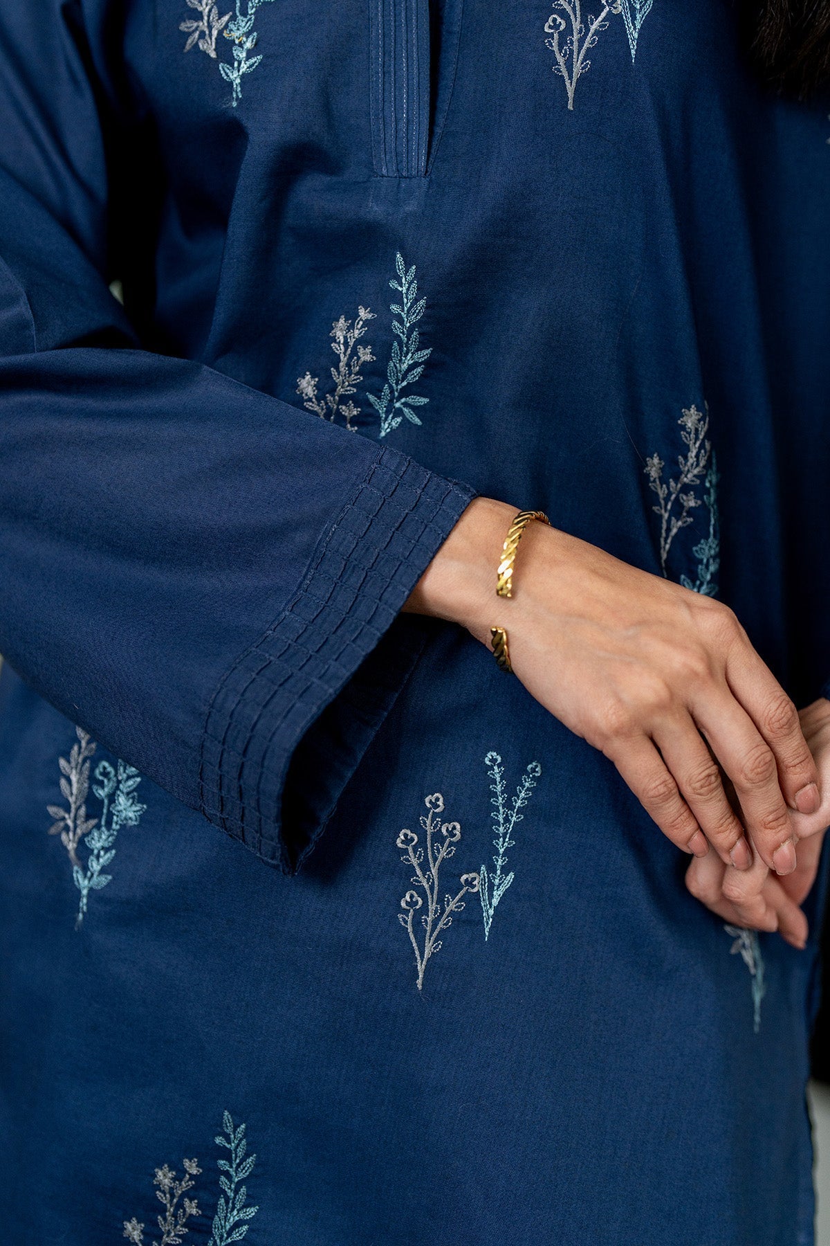 This blue co-ord set features floral embroidery on the front, neckline with pintex details, and paired with a tapered shalwar.