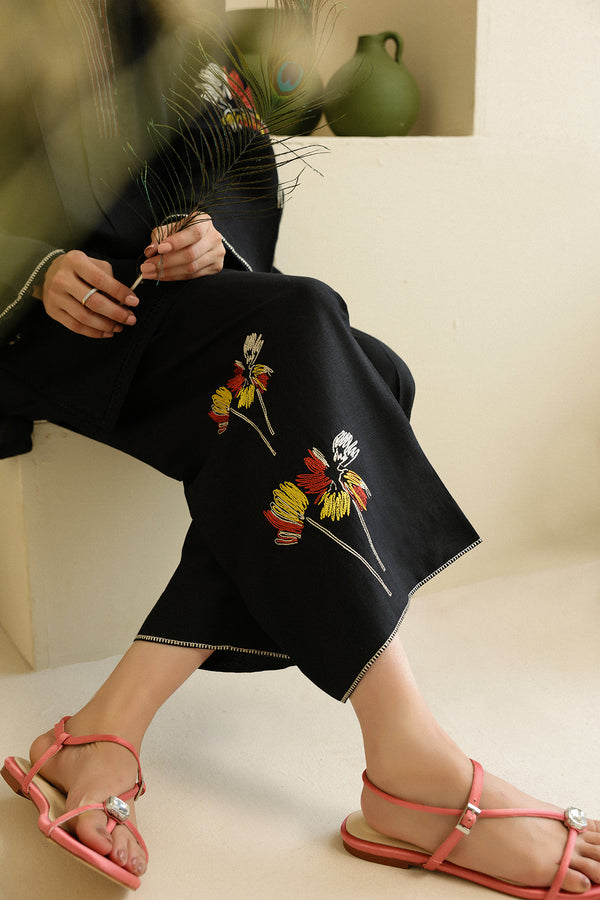 This black outfit is a contemporary ensemble featuring a straight cut kurta and chic culottes. The sleeves and pants has embroidered floral motif which offers the perfect mix of comfort and breezy seasonal charm.