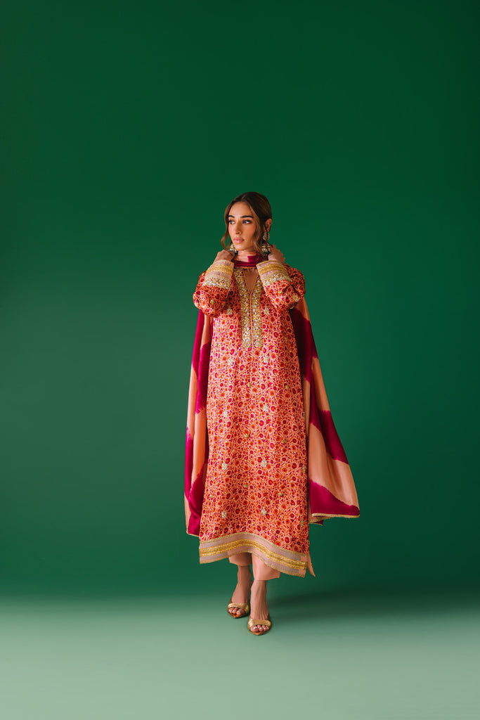 A pure charmeuse silk screenprinted long shirt full of hand embellishments on the neckline and sleeves. Also hand embellishments spray all over the shirt. Finished with organza and gota lace borders on daaman and sleeves. Paired either pure rawsilk 60 gms rawsilk straight pants.