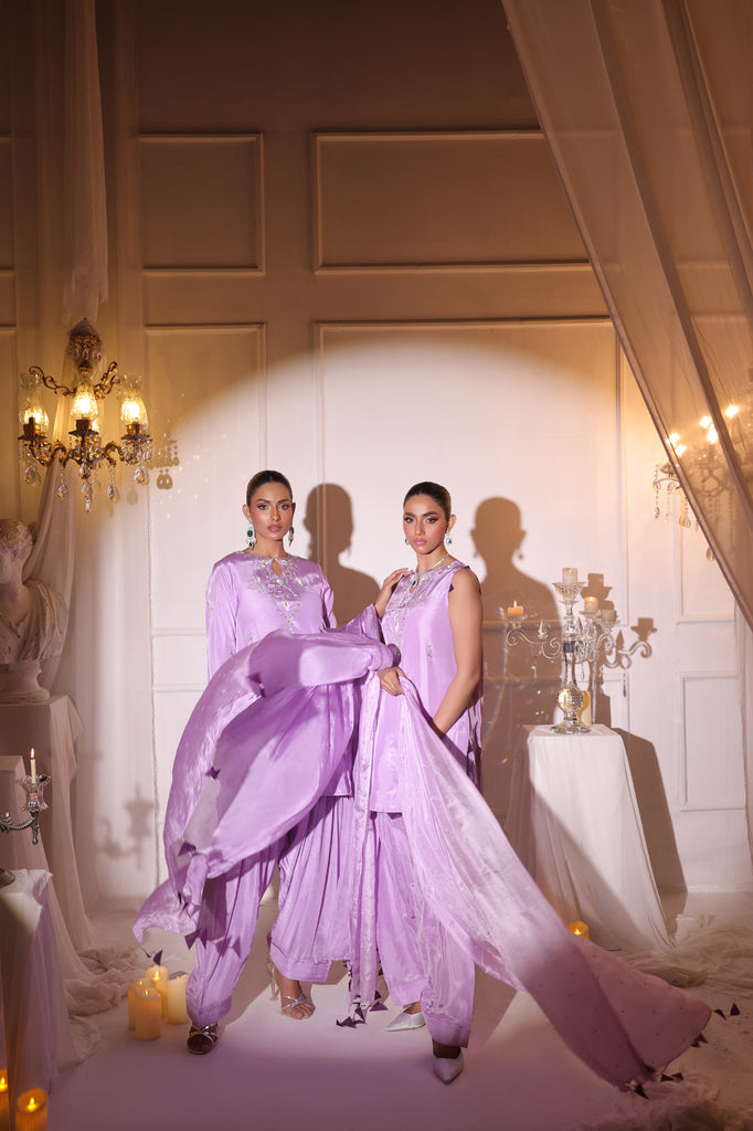 A pure tassel silk lavender short shirt with gorgeous embellishments on neckline, sleeves and front. Kora, dabka, reshamwork, rhinestones and sequins work. Finished with purple organza detailing on daaman and sleeves. Paired with a pure tassel silk khuli shalwar. Dupatta is pure medium silk with sequins spray all over and finished with purple organza tassels on both sides.