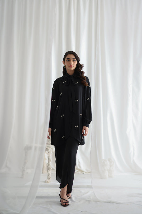 Black georgette shirt adorned with hand embroidered motifs on the front and embellished with lace. It can be paired with matching pants.