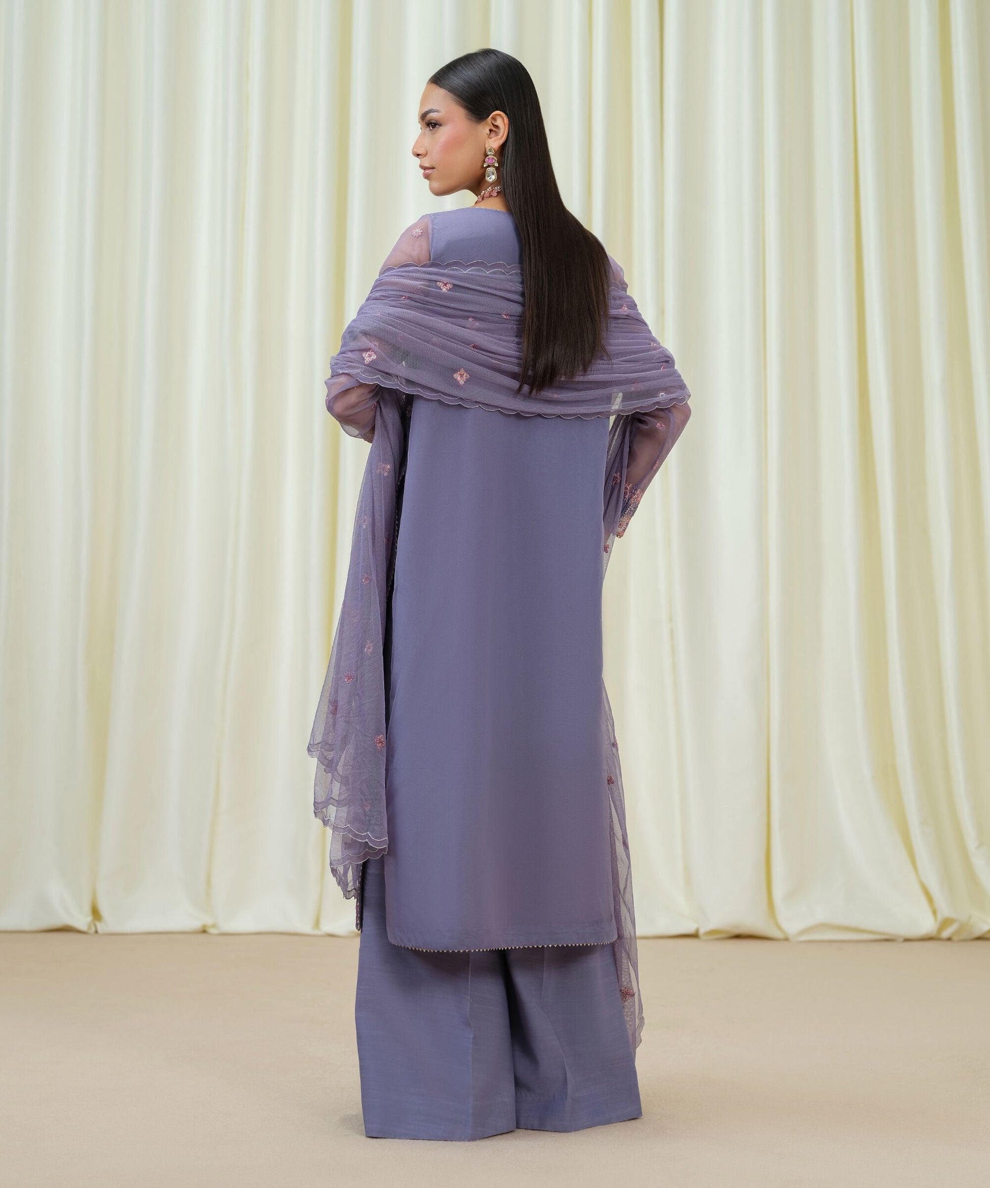 Make a sophisticated statement with our three-piece formal grey ensemble featuring a blended organza shirt paired with a blended net dupatta and viscose raw silk trousers.