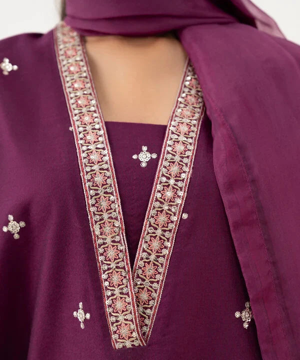 Make a statement in our embroidered purple blended silk cotton net A-line shirt paired with matching viscose raw silk flared trousers and a blended organza dupatta.