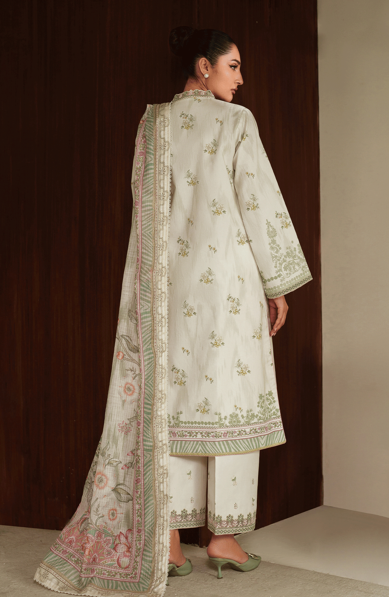 Elverra exudes timeless elegance in soft ivory with sage green accents. Featuring an embroidered neckline, sleeve hems, and trouser hems, this floral digital printed cambric set is paired with a Fancy Monar dupatta for a graceful, refined finish.
