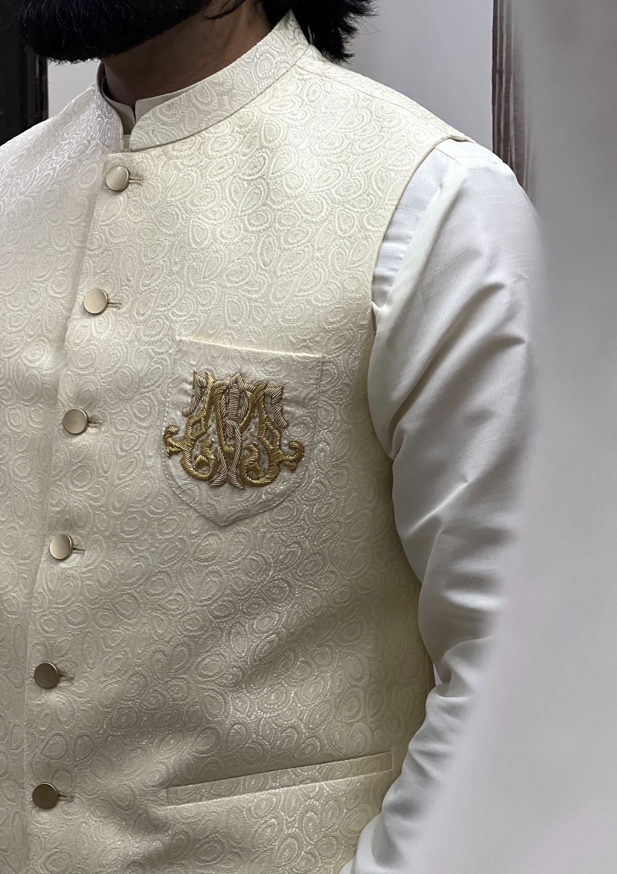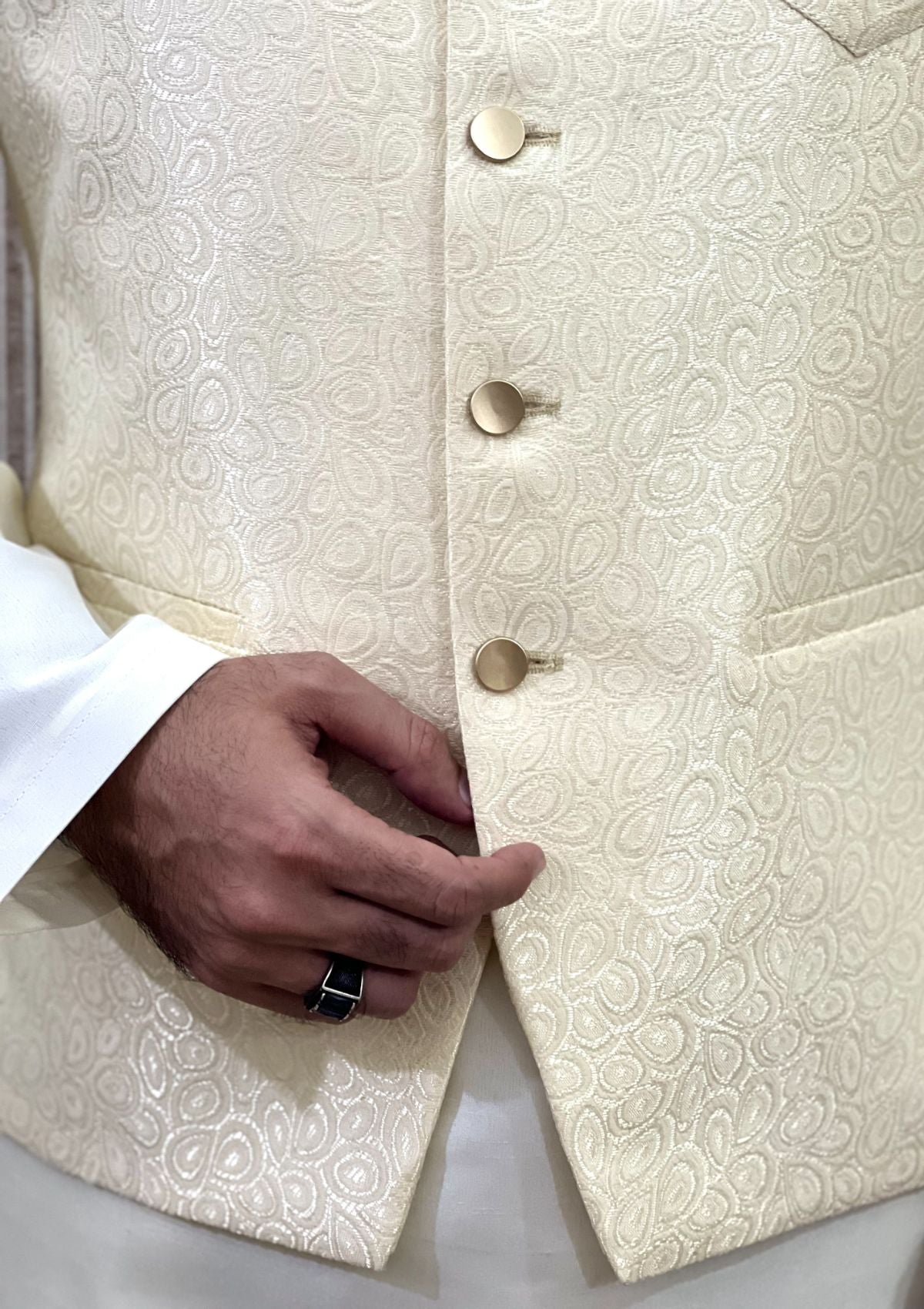 IT IS AN OPEN STYLED IMPOSED TEXTURED JAMAWAR WAIST-COAT.