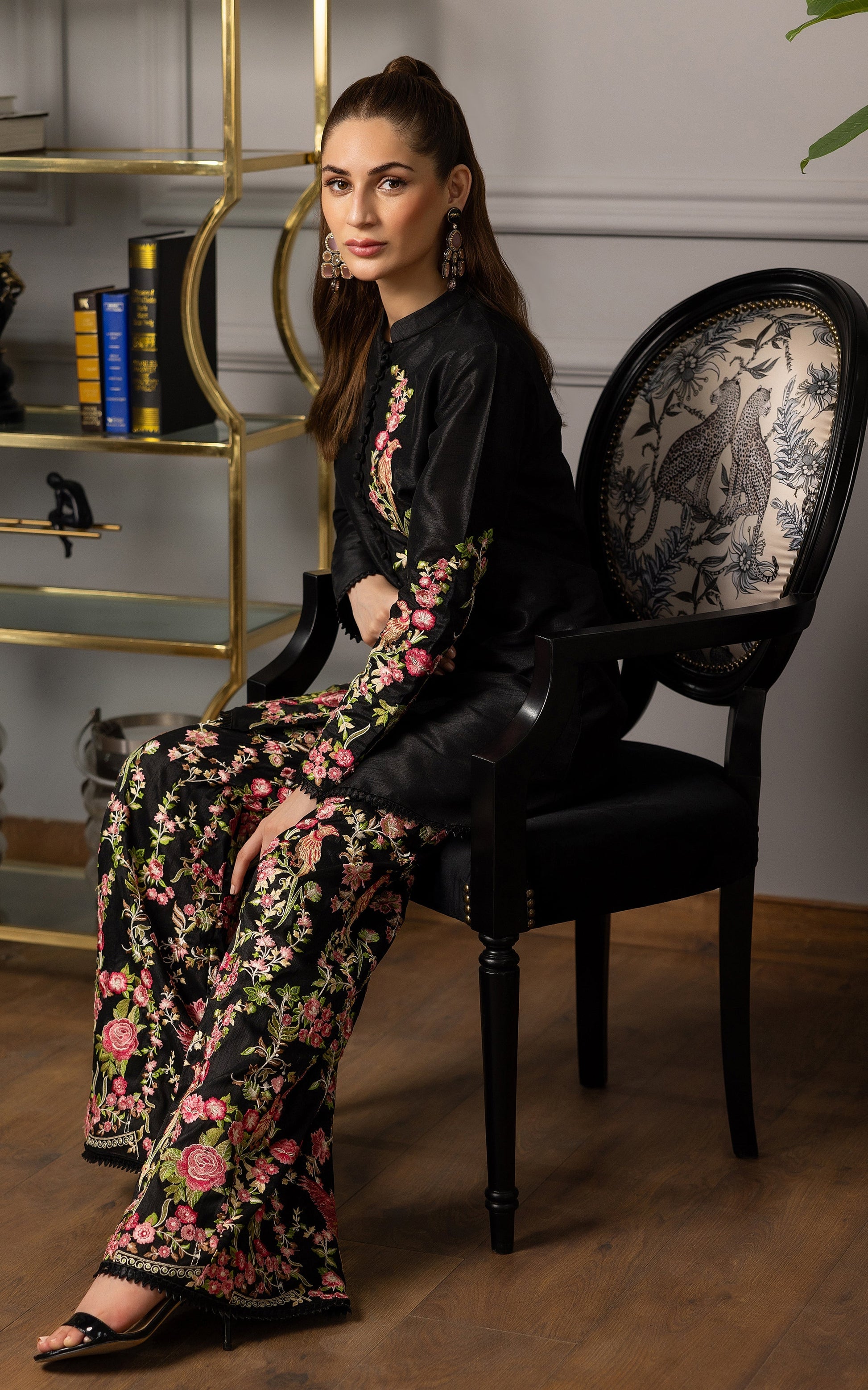 Make a bold statement in a raw silk floral Embroidered Jacket with matching heavy embroidered trouser set, designed to turn heads and leave a lasting impression. The exquisite pink and green embroidery adds a pop of color to this modern and chic outfit,