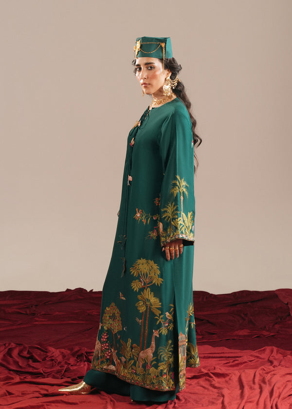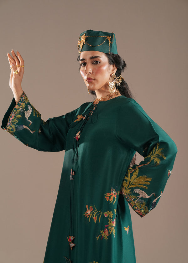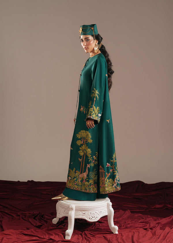 Crafted in a deep emerald green hue, this outfit exudes a mysterious charm. Made from pure raw silk, it carries a luxurious and timeless appeal. The embroidery, inspired by the beauty of nature and the grandeur of Shikar gah, adds an elegant touch with its intricate detailing. Each motif enhances the richness of the Resham, making the ensemble a perfect balance of sophistication and allure.