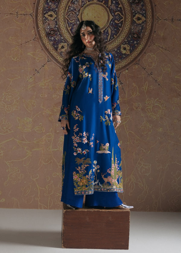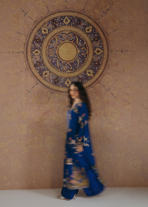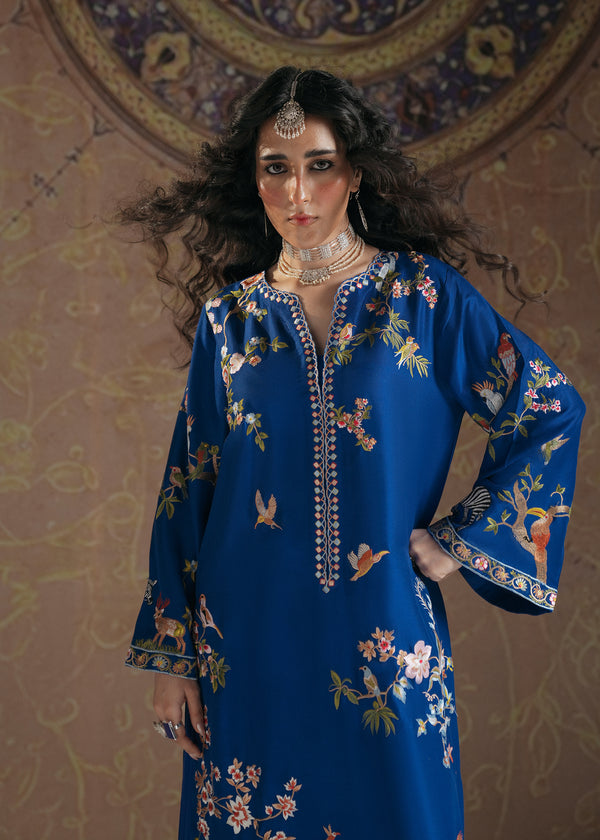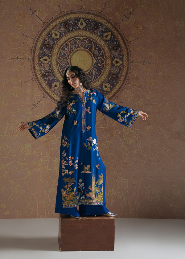 This stunning ensemble is crafted from pure raw silk, exuding elegance with its natural sheen and luxurious drape. The design is adorned with intricate embroidery inspired by Shikargah artistry, depicting a timeless narrative of flora and fauna in vibrant threadwork. The deep royal blue base enhances the detailed motifs of birds, animals, and nature, creating a regal and sophisticated look. Paired with wide-legged raw silk trousers, the outfit strikes the perfect balance between tradition and modern refinement-for making a bold cultural state.