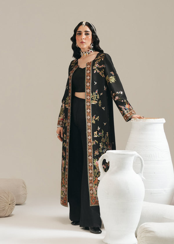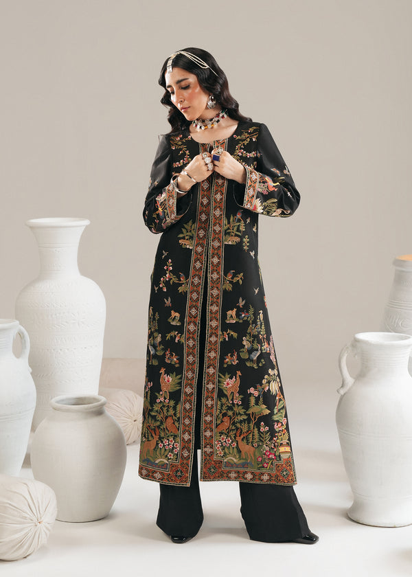 Crafted from the finest pure raw silk, this black long jacket blends tradition with modernity in a striking way. The silhouette is sleek and contemporary, designed to exude sophistication while maintaining timeless elegance. The embroidery draws inspiration from the classic Shikar gah, reimagined with a modern twist-where intricate motifs are redefined with bold patterns and refined detailing. Each element is thoughtfully visualized to create a sense of deep enhancement, giving the jacket a regal yet fashion-forward aura. Perfect for those who appreciate heritage artistry with a contemporary edge, this piece is a statement of elegance, power, and modern luxury.