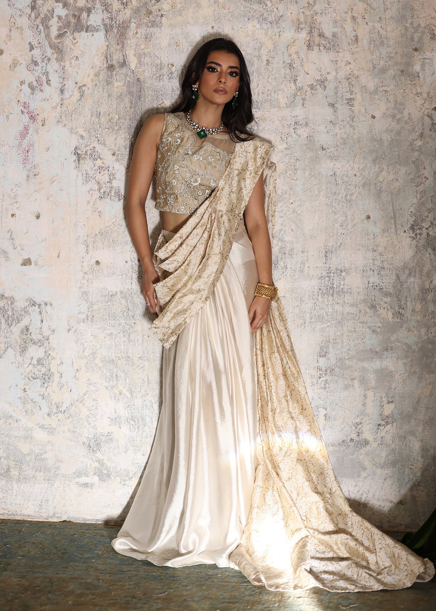 This serene ivory mushroom saree drapes effortlessly with a contemporary touch. The fabric flows beautifully, adorned with exquisite embroidery in ivory, silver, and pearl that creates a mesmerizing pattern. The elegant block print on the drape adds understated luxury, making this saree a perfect choice for special occasions and cultural celebrations