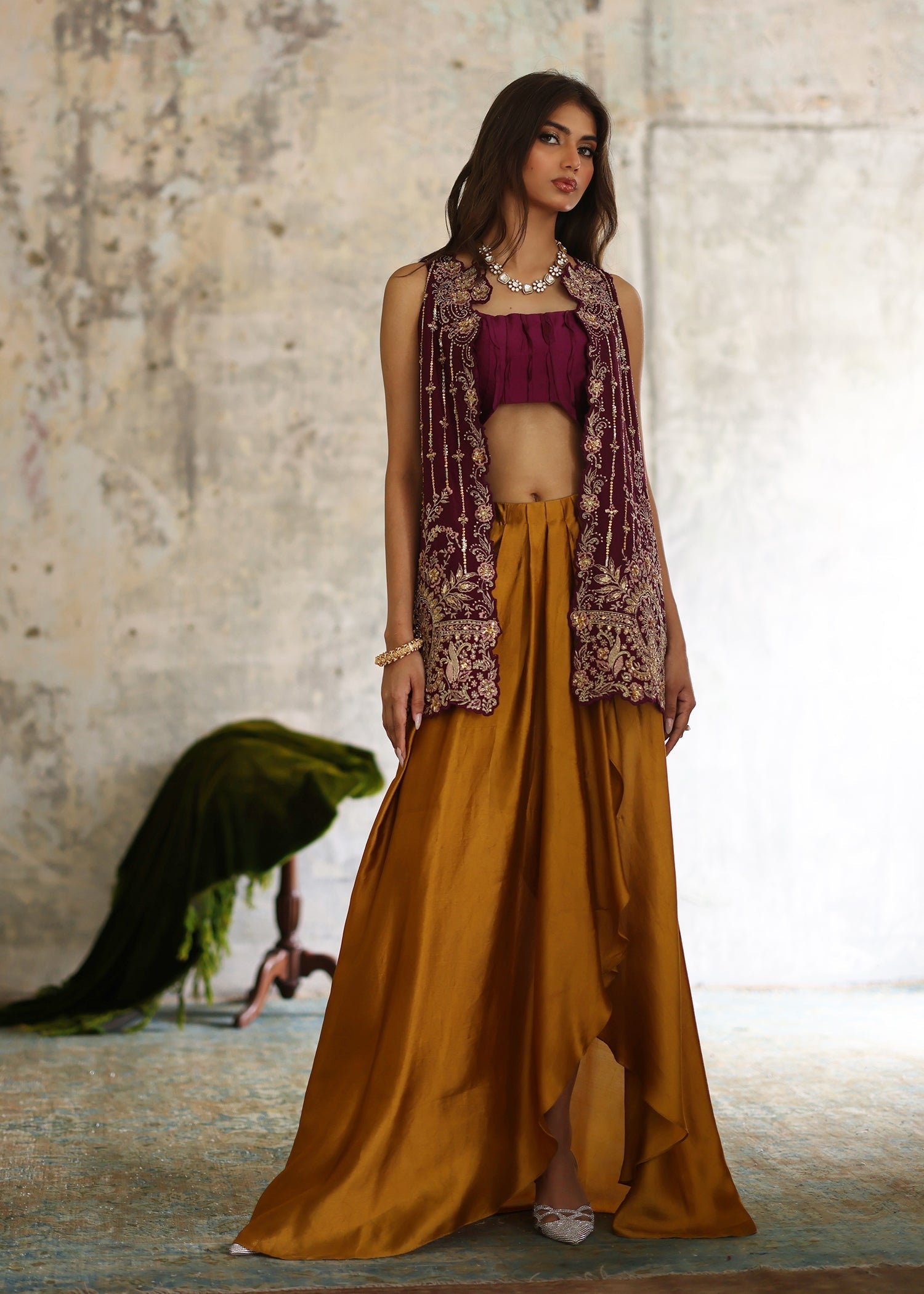 This striking dress features a mustard skirt with a contemporary cutline that adds a fresh, modern edge. The plum bustier is expertly tailored for a flattering fit, while the sleeveless short jacket in rich plum caspia, adorned with exquisite hand-embroidered details. Together, these elements create a sophisticated and elegant ensemble, perfect for making a statement at any special occasion.
