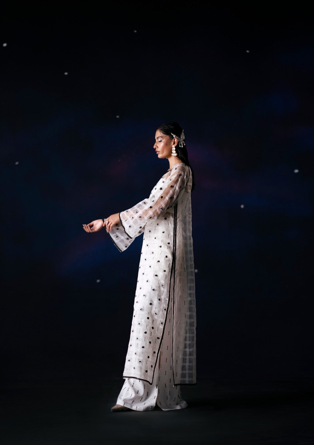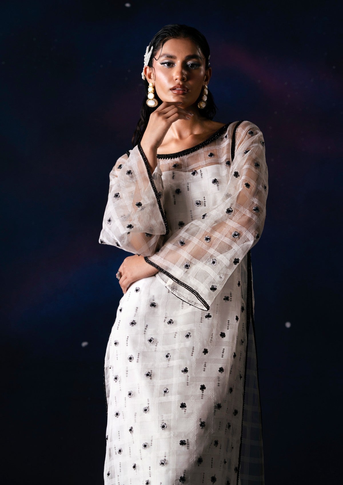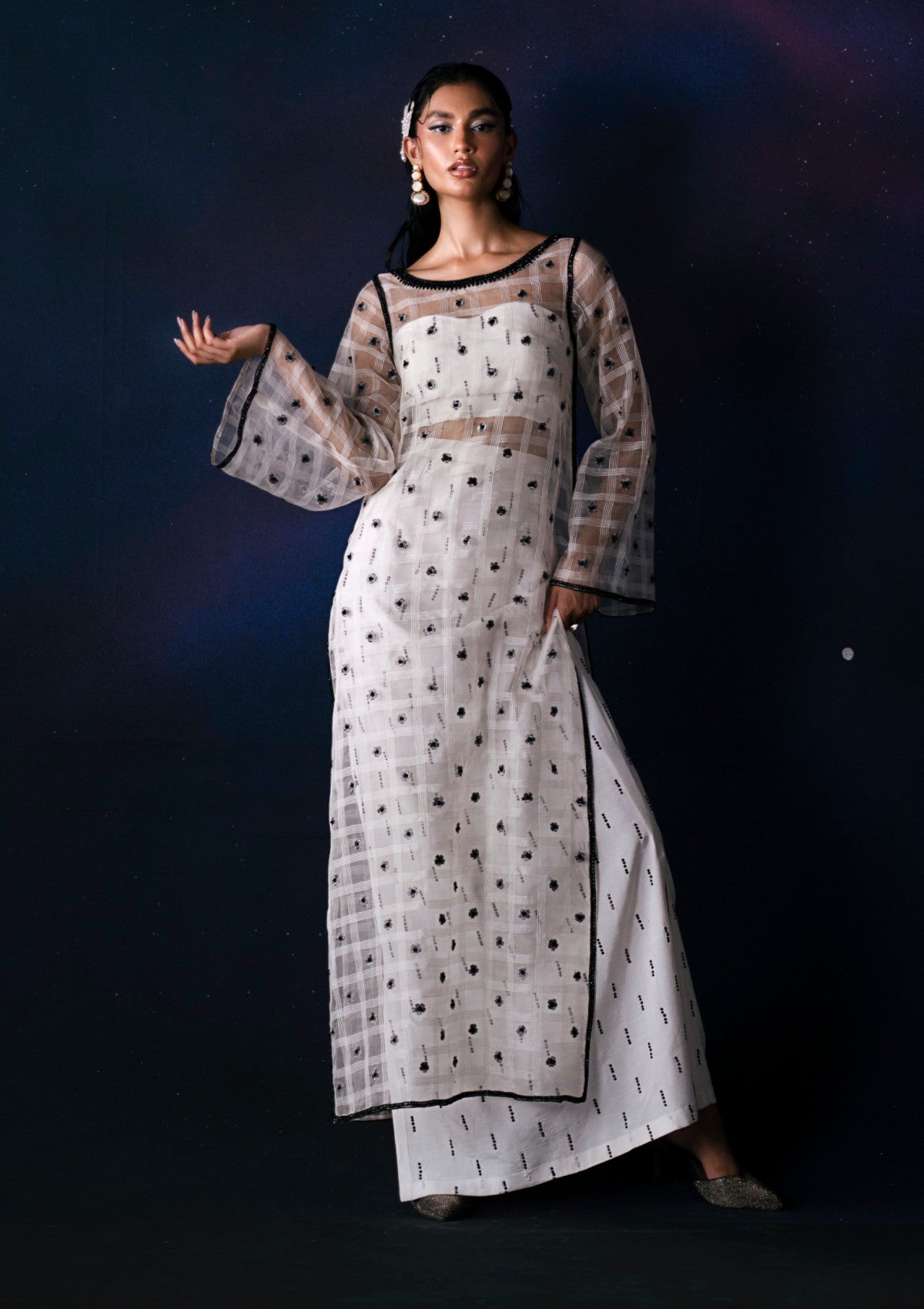 The white self-organza shirt features delicate floral sprays with sequined accents, framed with hand-crafted black embellishments detailing that extends gracefully from the neckline to the hemline. The sleeves are adorned with a floral spray and white sequins. The ensemble includes a slip with a subtle black stone spray and is paired with a UKi raw silk pencil skirt, exquisitely finished with a refined black stone embellishment.