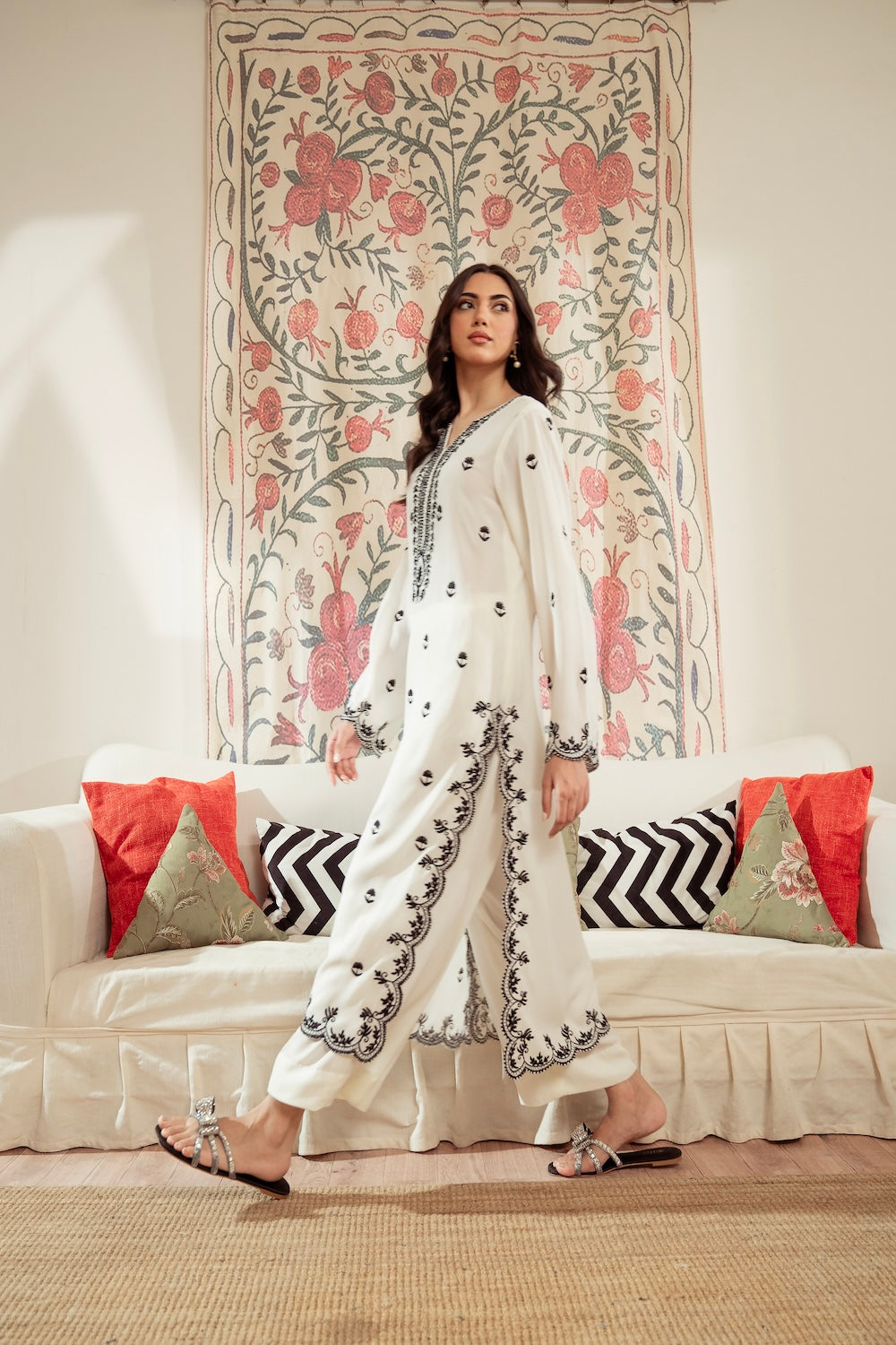 Morich is a softest color of off-white, handcrafted with an overall heavy jaal, embroidered neckline, front and back cut-work detailing in resham. This delightfully detailed piece can easily translate from effortless glam to extravagance.