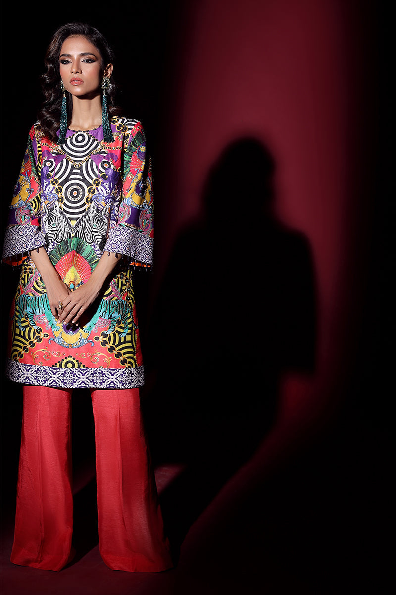 Formal Custom Digital Printed Jungle Prints Shirt Featuring Floral, Zebra And Tiger Motifs. Hand Embroidered With Heavy Sequin And Bead Work On Printed Motifs. Paired With Tangerine Trouser To Complete The Look.