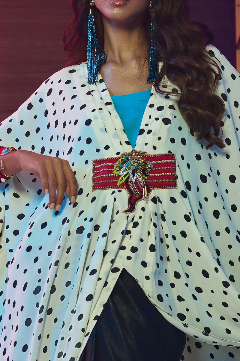 3pc Formal Drape. Poncho style drape shirt with contrasting applique on the front and thread details on the cuffs. Featuring crystal and bead embelished lion motif. Paired with sky blue inner and velvet silk Drape skirt.