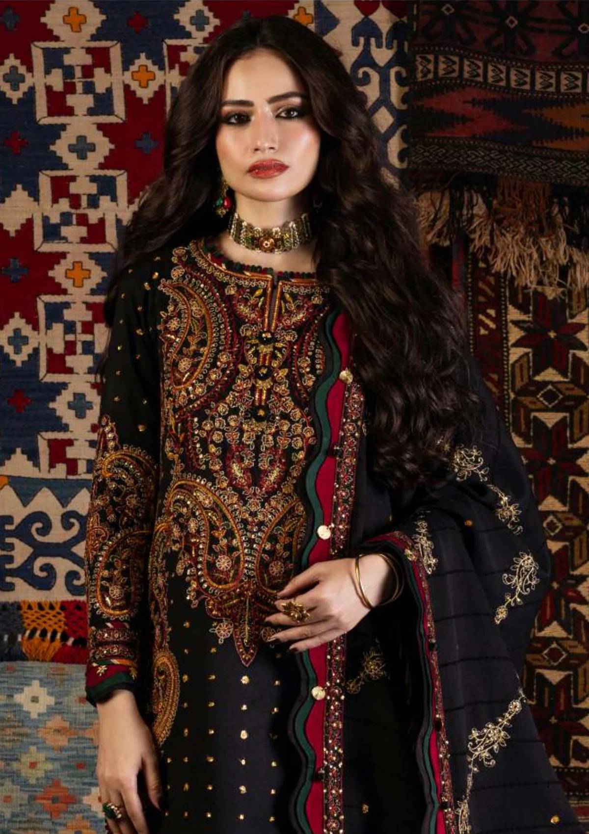 Elegance in the darkest hours, this black ensemble is a stunning piece that exudes the essence of a Kashmiri night. The embroidery, adorned with maroon, mustard, and beige hues, complemented by cupped golden sequins and zari, forms an intriguing design layout, much like the intricate stories hidden in the shadows of the night. The shirt and shawl reflect the same captivating design, making it a piece of traditional art. The embroidered details add a touch of grace and tradition, while the bunches infuse a hint of mystery. Sana Javed graces this ensemble, embodying the elegance of a Kashmiri night.