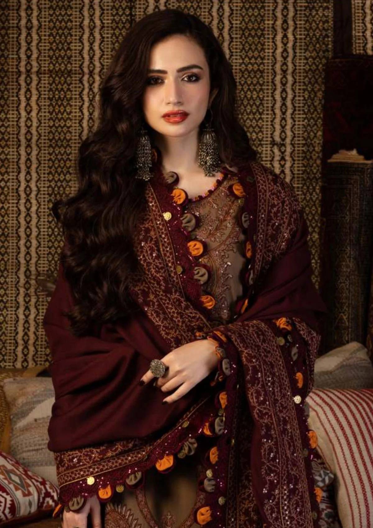 Experience the regal allure of Taupe and Deep Mahogany. This ensemble is an embodiment of cultural elegance, adorned with maroon, taupe, dull pink, and rust thick cotton threadwork, interlaced with transparent sequins. The stitches in this design are inspired by the intricate work on Pashmina Shawls, crafted with single threads and open stitches. Every element of this ensemble is deeply inspired by Kashmiri Taanka, featuring culturally inspired motifs and designs. The embroidered neckline serves as a gateway to the captivating narrative, while the all-over embroidery for the front and back, accompanied by daman borders, creates a rich tapestry. The pair of embroidered sleeves with borders are a reflection of tradition. The embroidered shawl, complete with four-sided borders and additional bunches, envelops you in the allure of Kashmir's artistry.
