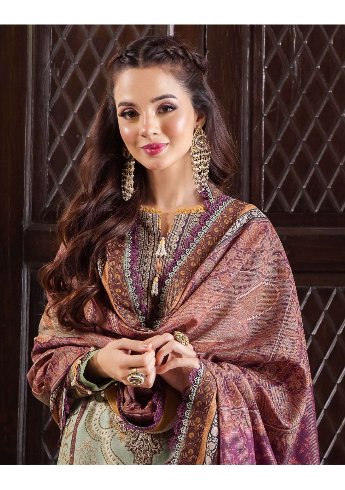 Adorn the canvas of sage green with this majestic ensemble, featuring traditional motifs elegantly printed and enchanting embroidery gracing the neckline. The maysori dupatta, a masterpiece in itself, boasts a captivating paisley-inspired print that adds a touch of timeless charm to the ensemble.