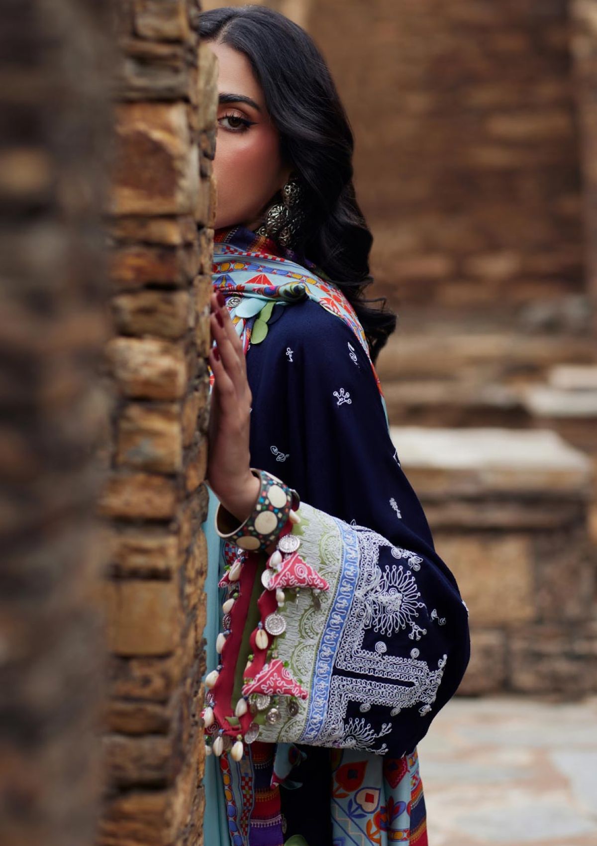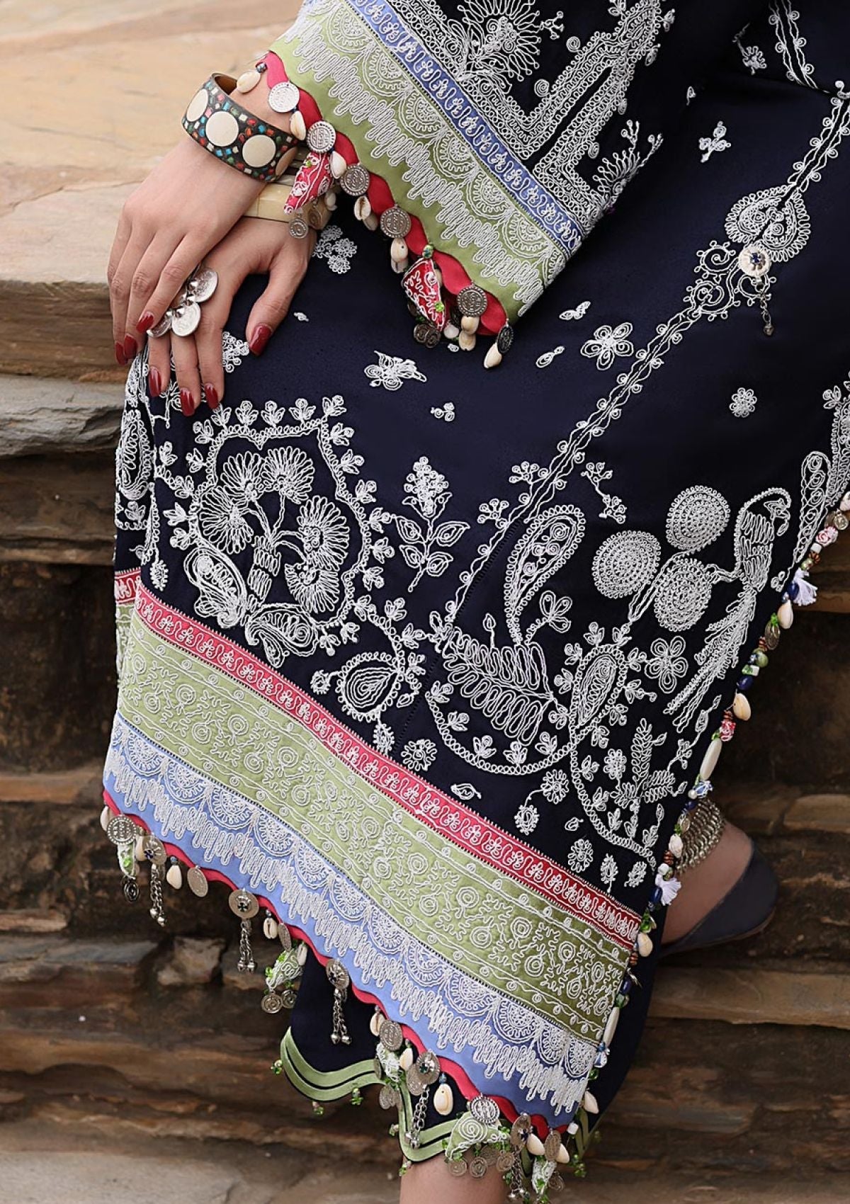 Introducing âÃÂÃÂMahroshâÃÂÃÂâÃÂÃÂa sublime union of opulence and tribal artistry. The deep midnight blue fabric serves as a luxurious canvas, adorned with intricate ivory embroidery inspired by ancient tribal motifs. Each stitch is a testament to meticulous craftsmanship, exuding strength and sophistication in a breathtaking visual masterpiece.