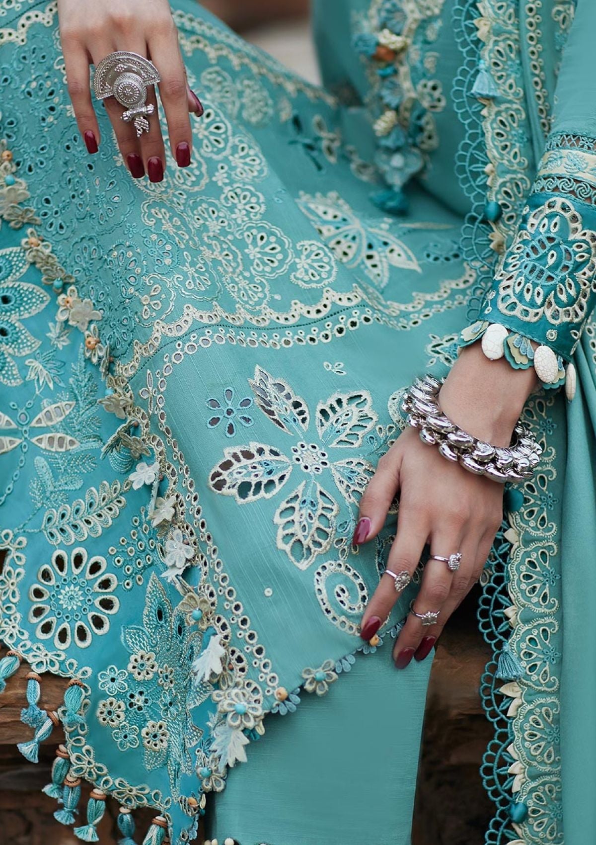 Behold "Celestia", a sartorial masterpiece that embodies the serene elegance of a winter's dream. Draped in a soft Tiffany blue hue, this ensemble becomes a canvas of unparalleled beauty, intricately embroidered with ivory florals in full, enchanting bloom. Laser-cut detailing adds a modern touch, creating an exquisite interplay of texture and artistry.