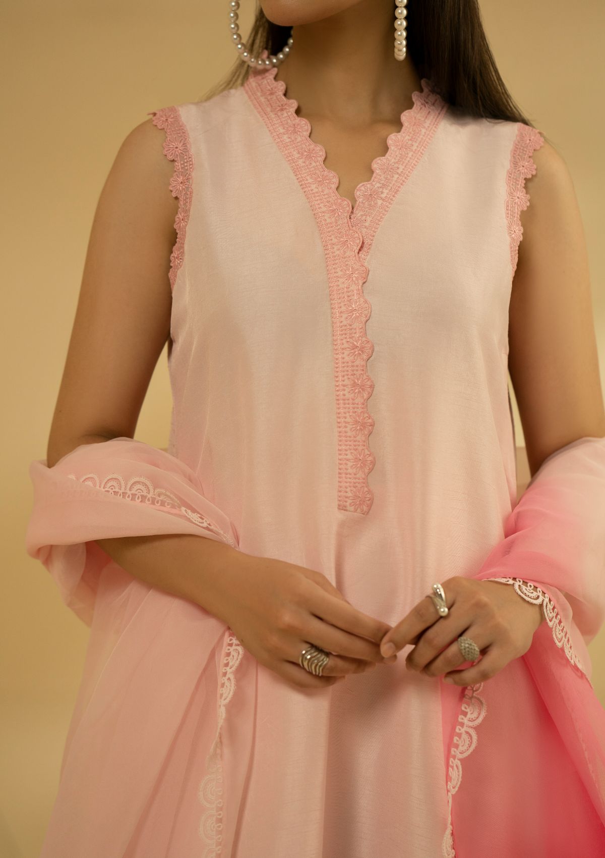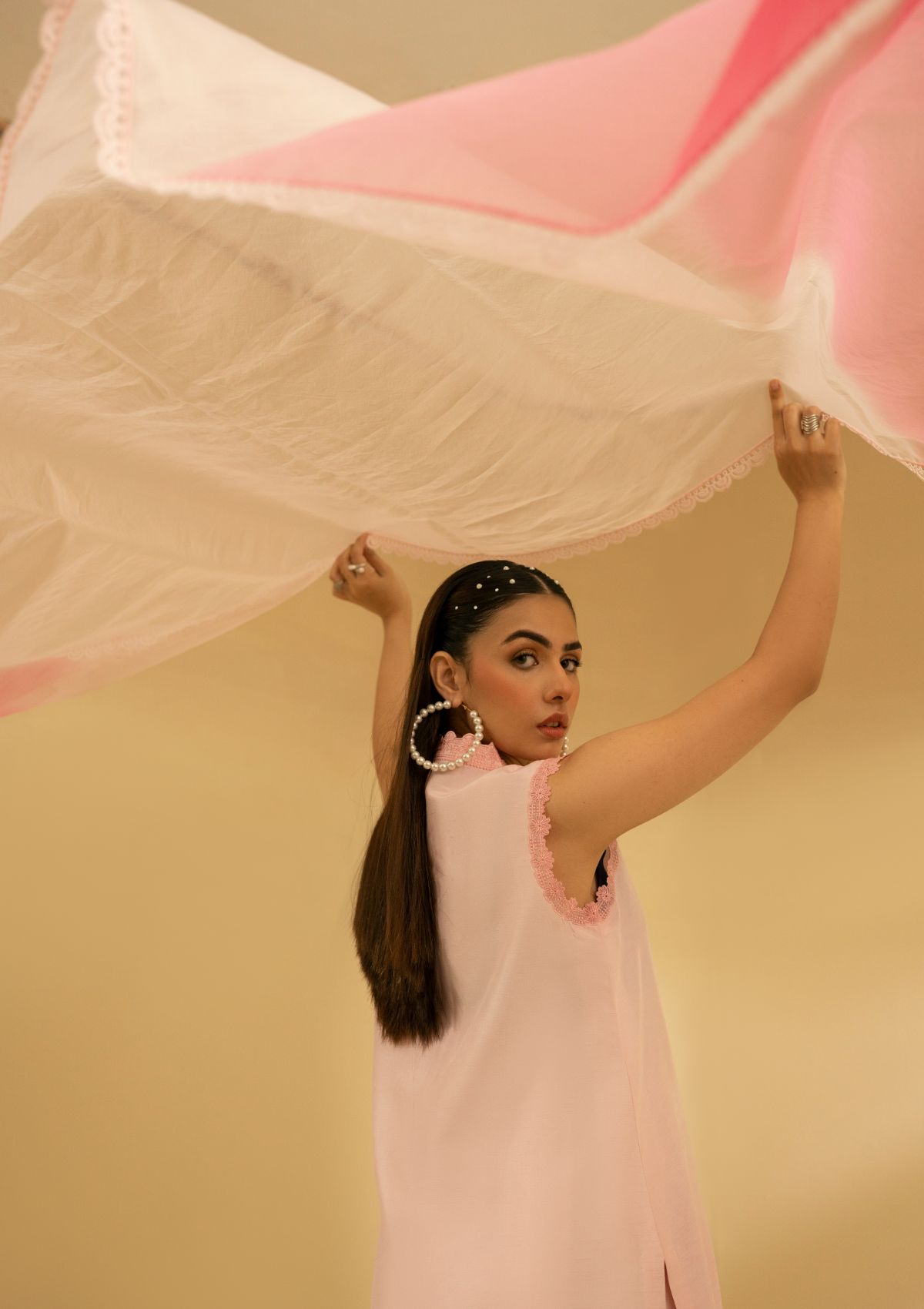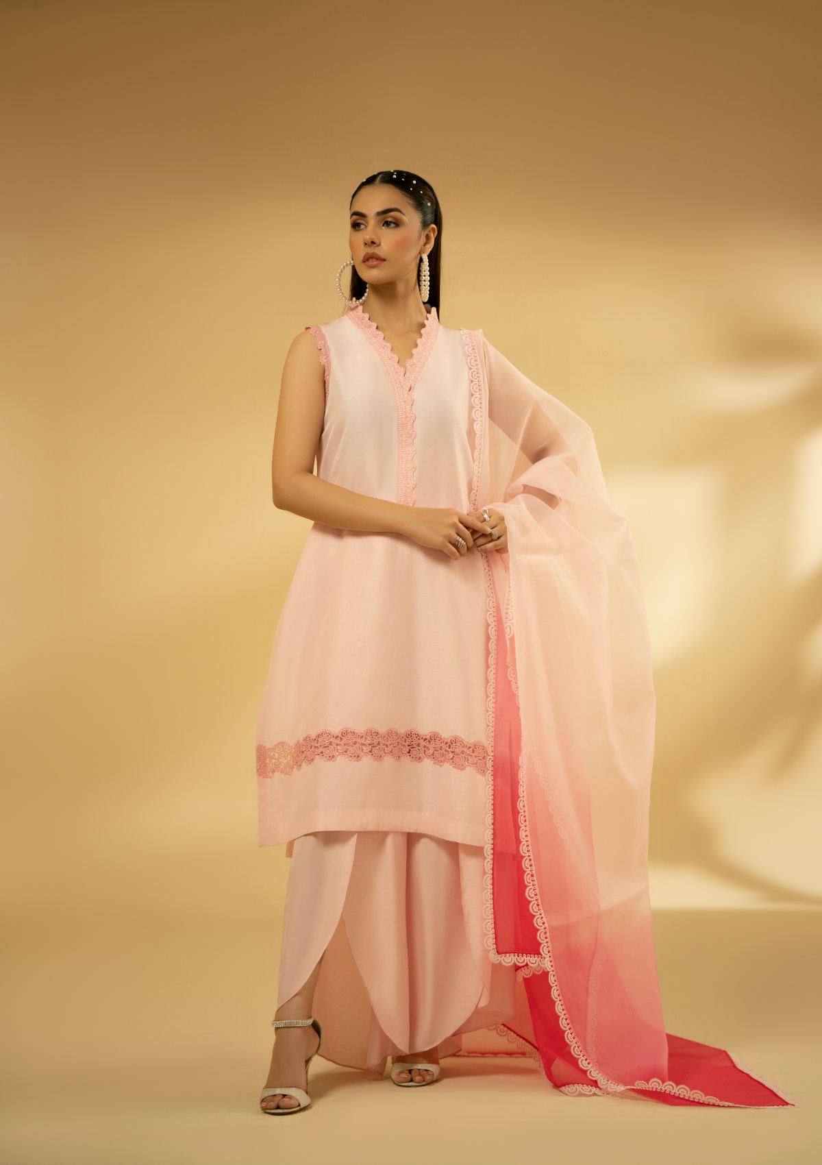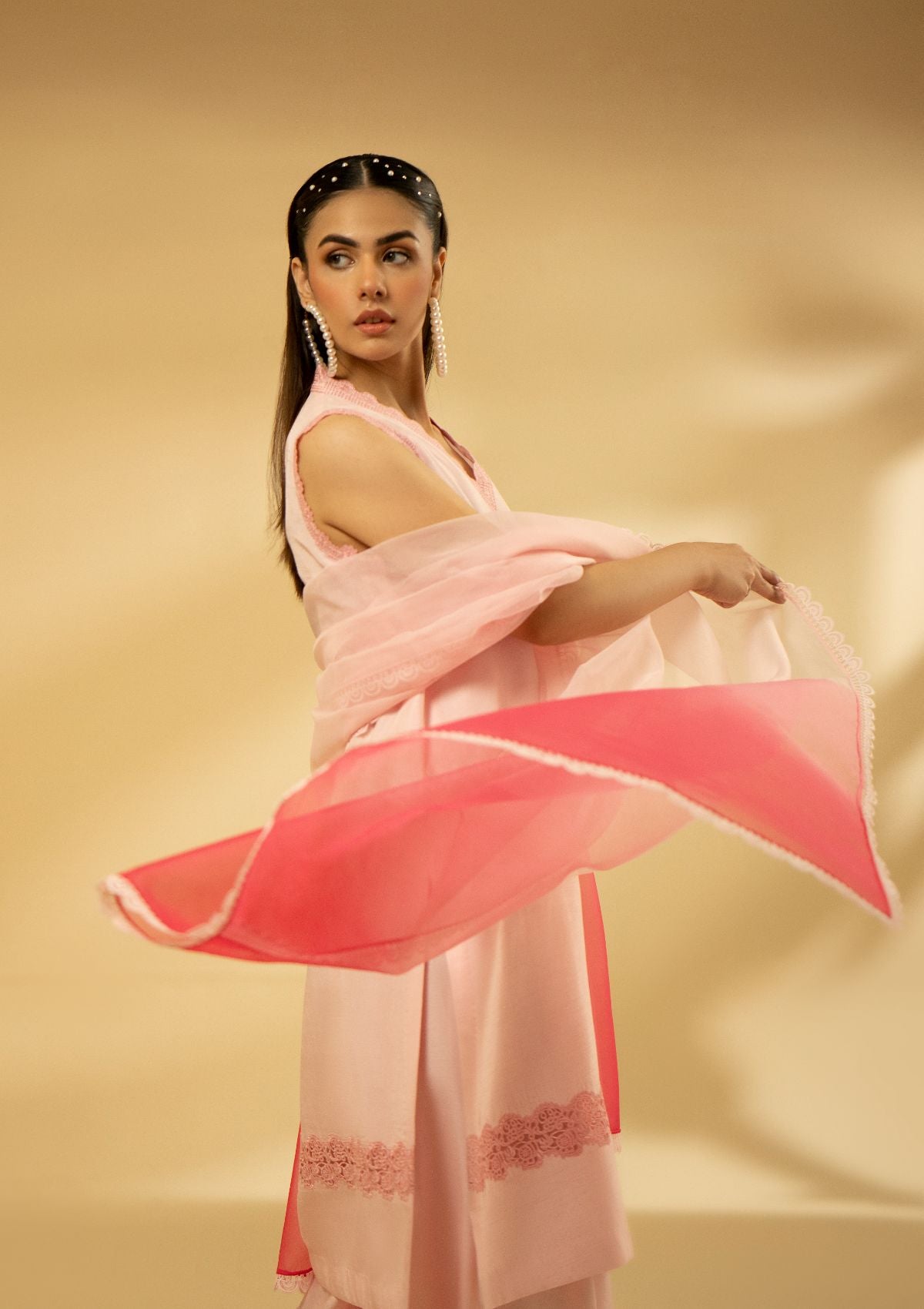 Completing the look is an ethereal Organza dupatta with a beautiful gradient effect and a lace finish, reminiscent of cascading petals. The loose flared tulip trouser ensures both comfort and style.