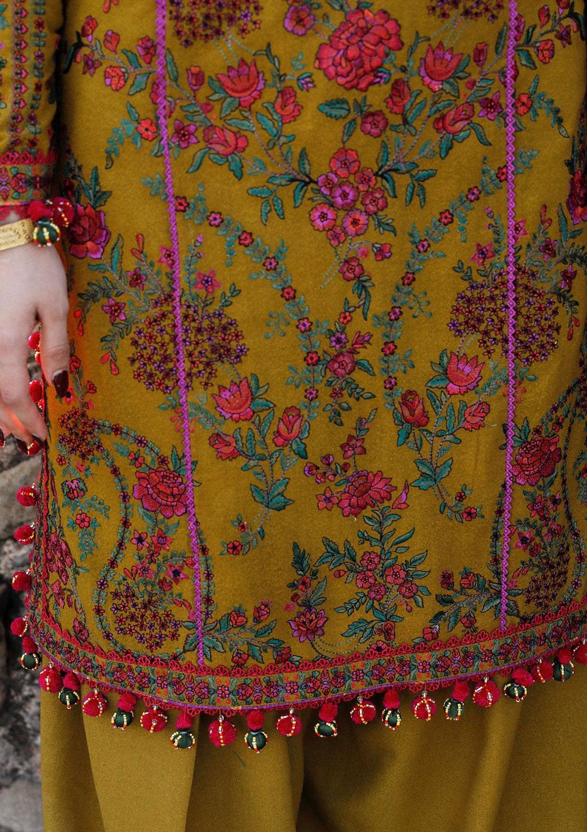 - Aureate-Radiate warmth and charm in our mustard outfit from the Karandi AW'23 collection. Elegantly paired with a Karandi shawl, this dress is adorned with captivating floral motifs and intricate details.