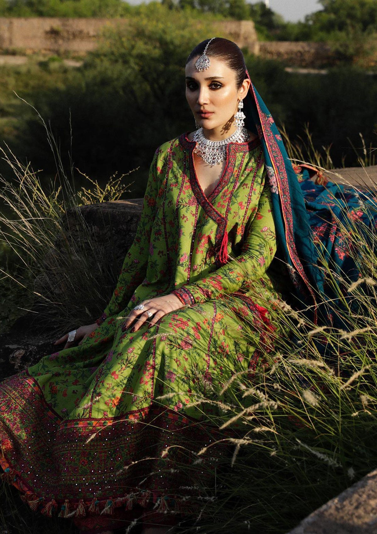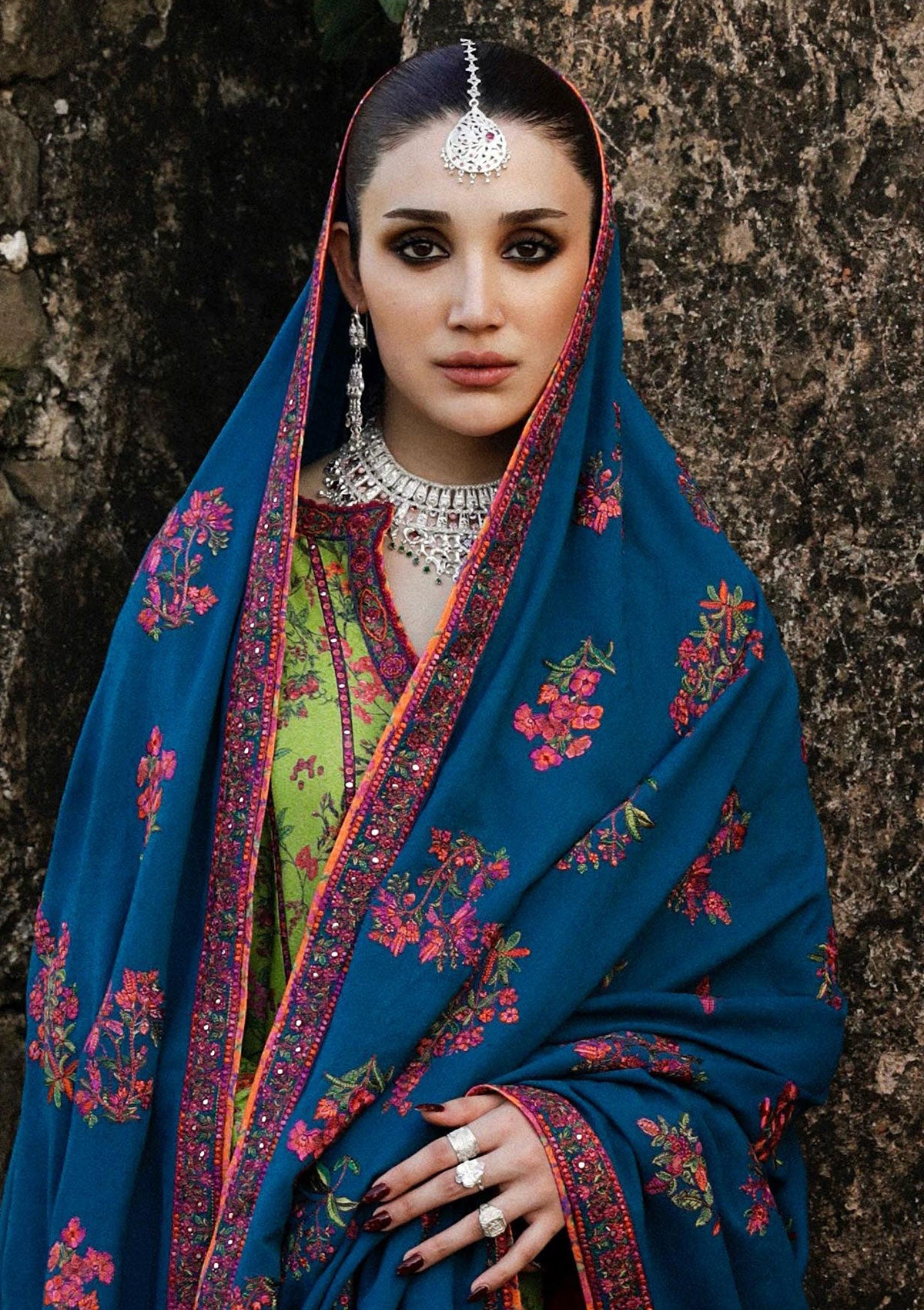 - Karandi AW'23 is a blend of elegance and artistry! This enchanting green ensemble, adorned with delicate floral motifs and intricate detailing, is paired with a stunning zinc Karandi shawl featuring mesmerizing mirror work