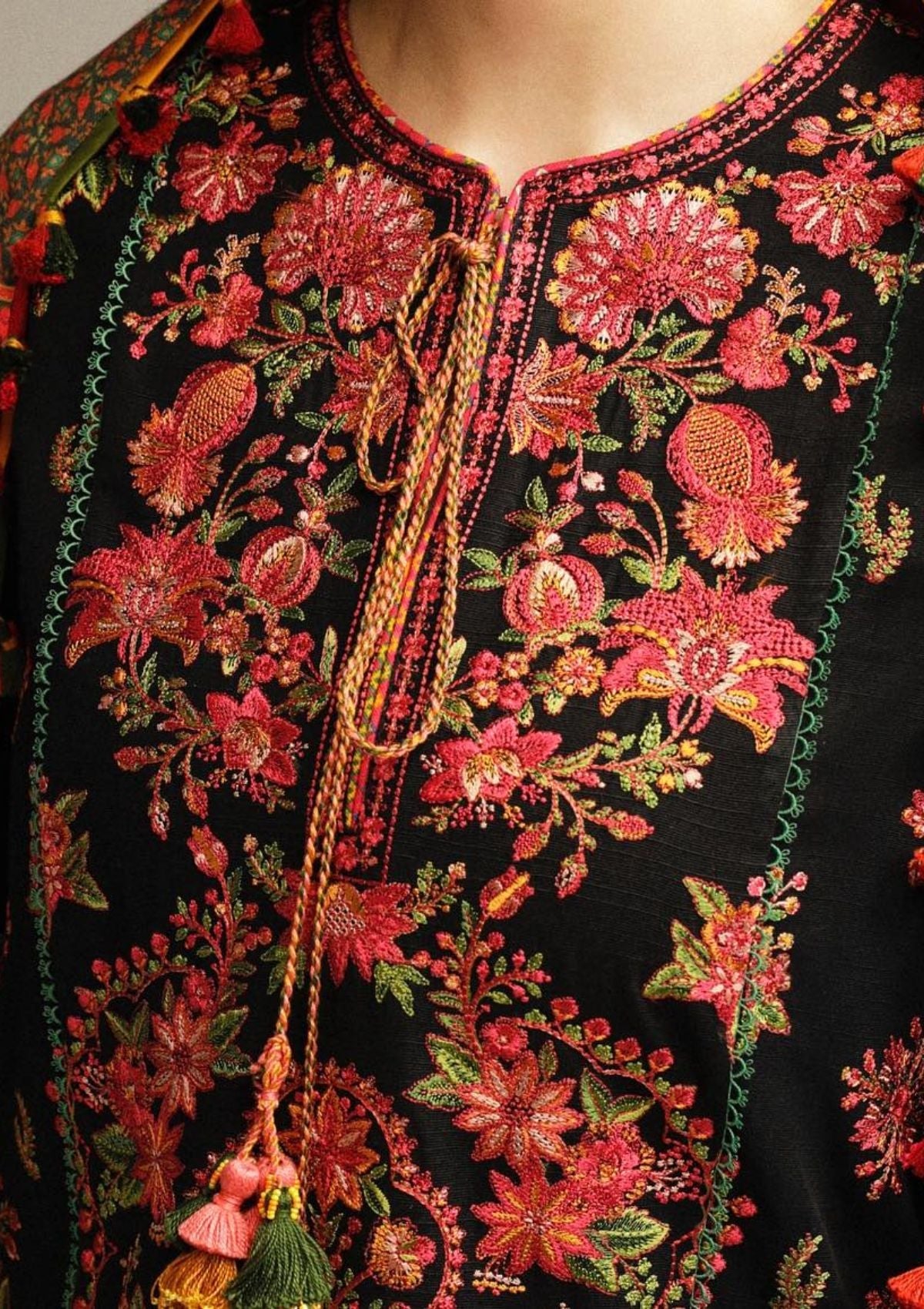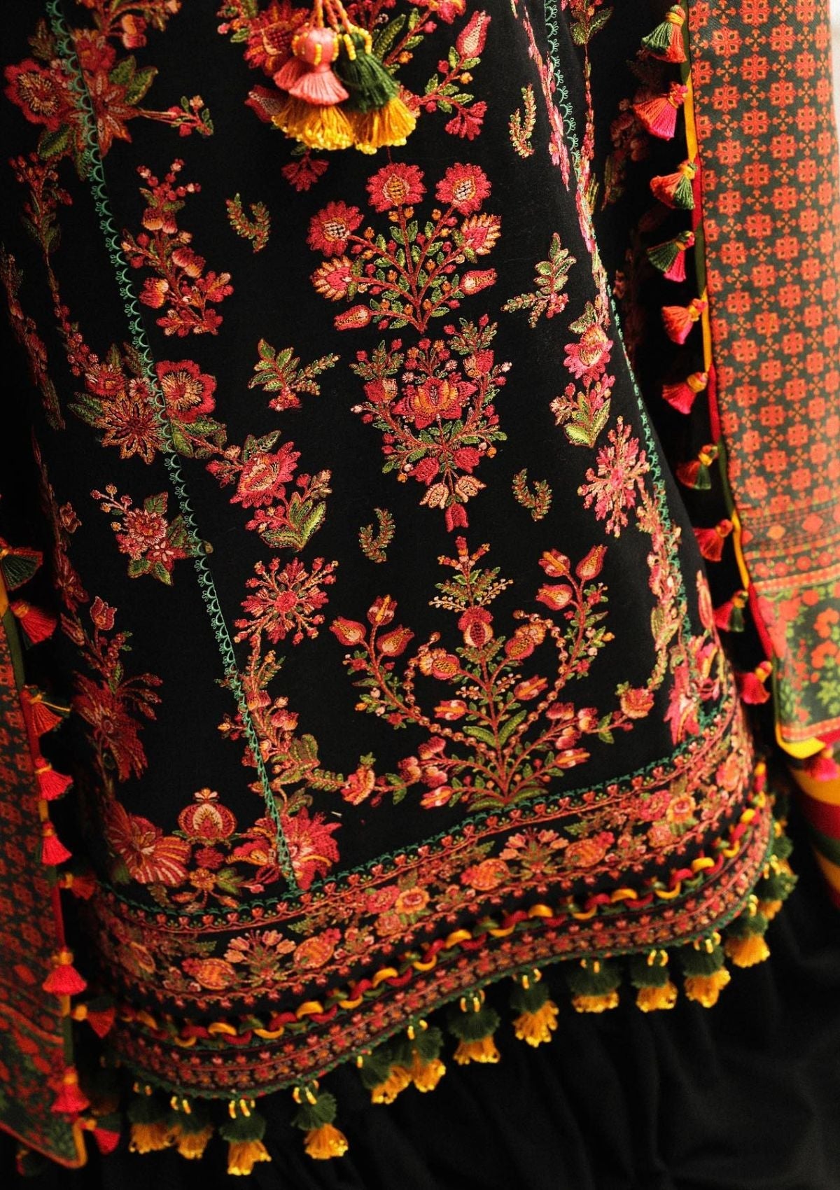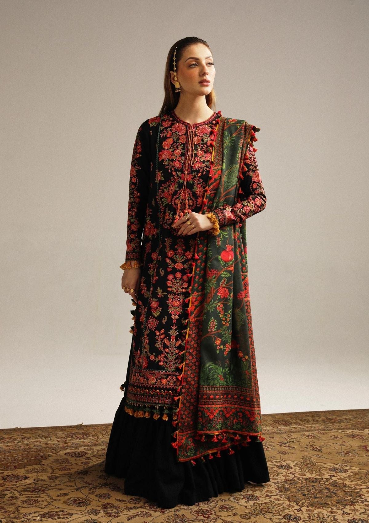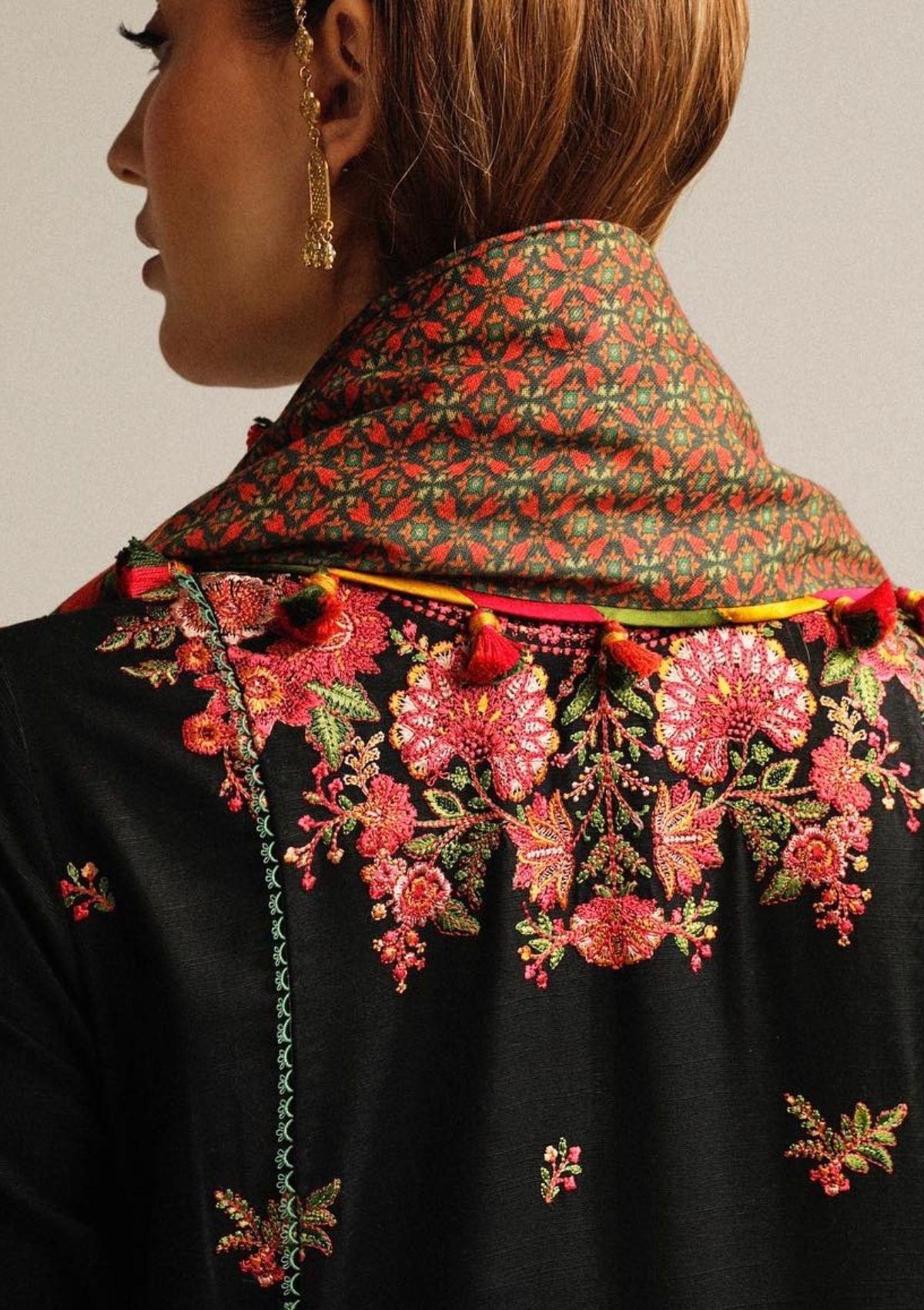 A chic black khaddar outfit that is sure to turn heads. The black base serves as a canvas for beautiful mustard and pink motifs, bringing a vibrant pop of colour. Paired with a green printed woollen shawl to elevate the look, this outfit is truly a vision of beauty and grace.
