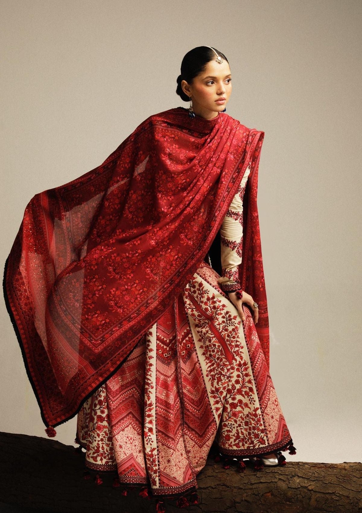 An elegant ivory-colored pishwas with a front-open design. The bodice and borders are exquisitely embroidered with shades of red and black, adding a touch of richness and depth. The outfit also features printed panels that enhance its visual appeal. It is paired with a stunning self-print design woolen shawl that perfectly complements the outfit.
