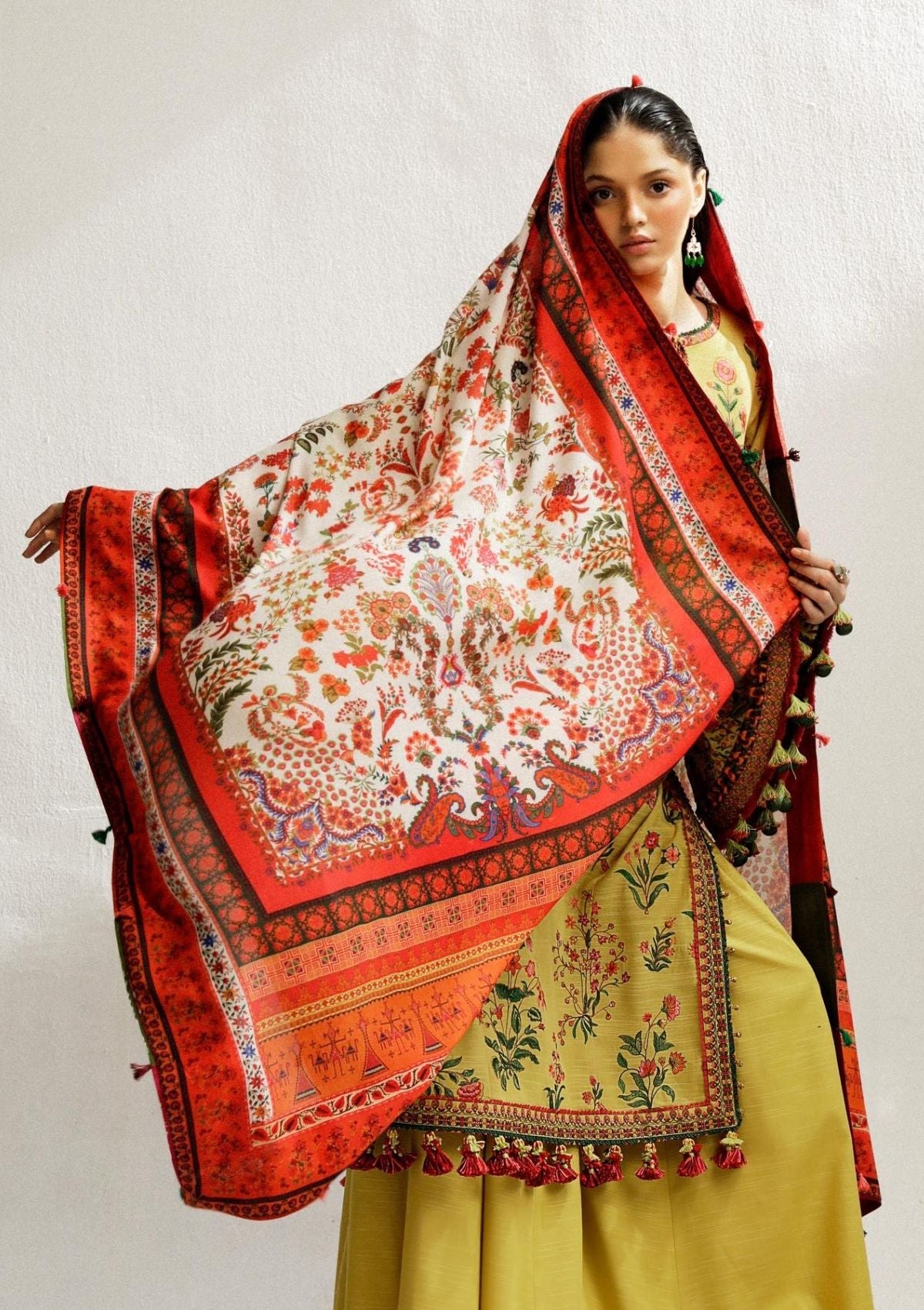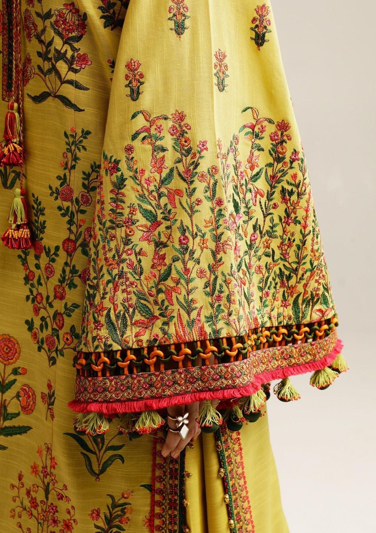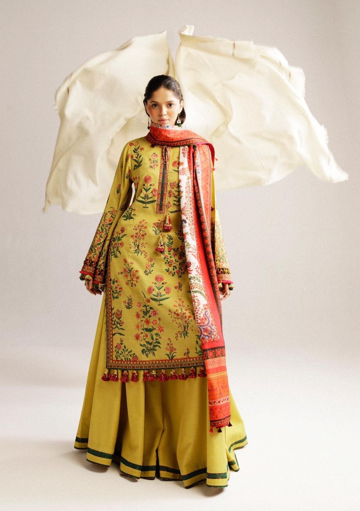 The stunning lime-yellow khaddar outfit is adorned with intricate floral motifs all over. The sleeves of this ensemble are heavily embroidered with detailed motifs, adding a touch of opulence to the overall look. It's a vibrant and cozy ensemble that exudes elegance, where the embroidery introduces delicacy and the printed shawl layers texture and visual interest.