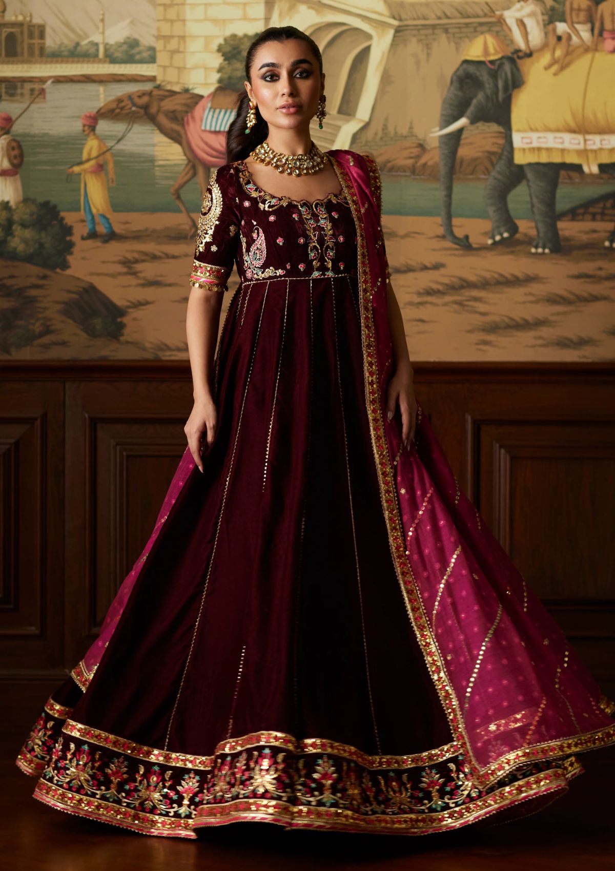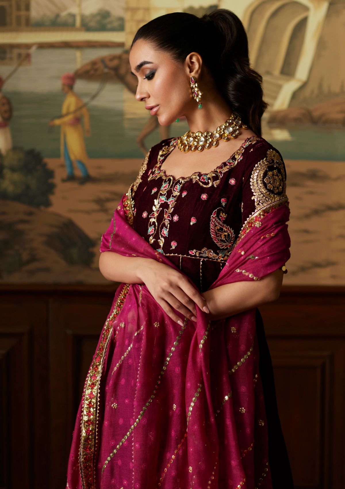 The perfectPISHWAASfor the festive wedding season! This PISHWAAS is made entirely in luxe velvet, with the bodice featuring a delicate floral neckline and complementary paisley