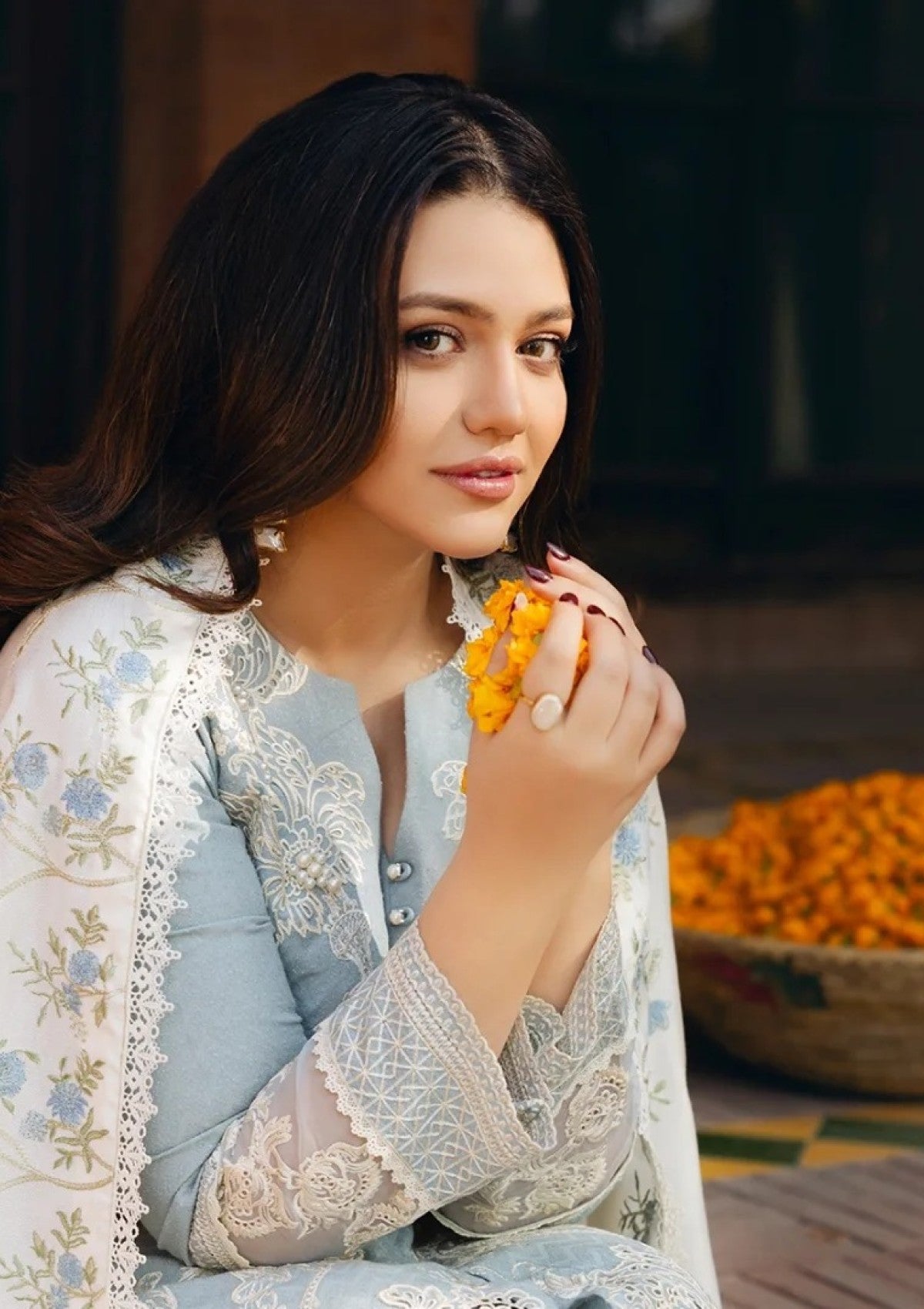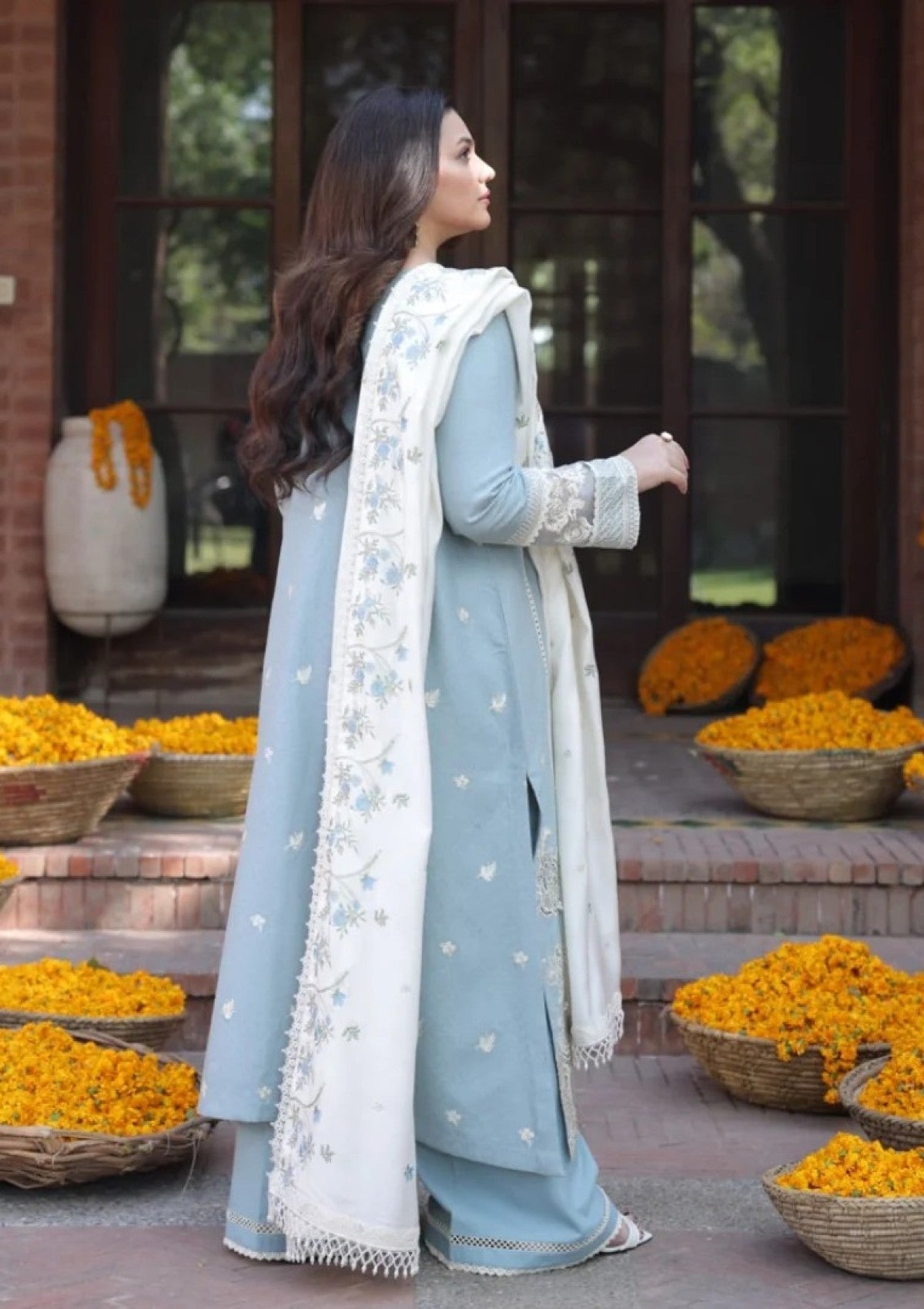 - Delicate and soft, Wasli is a 3-piece unstitched ensemble in soothing ice blue, crafted from self-textured Karandi. The shirt features intricate resham embroidery, crÃÂème colored cutwork floral motifs, and a delicate lace border, with embroidered organza-inlaid sleeves. Paired with a plain Karandi trouser and a pashmina shawl adorned with soft ice blue and green embroidery, it embodies timeless winter elegance.