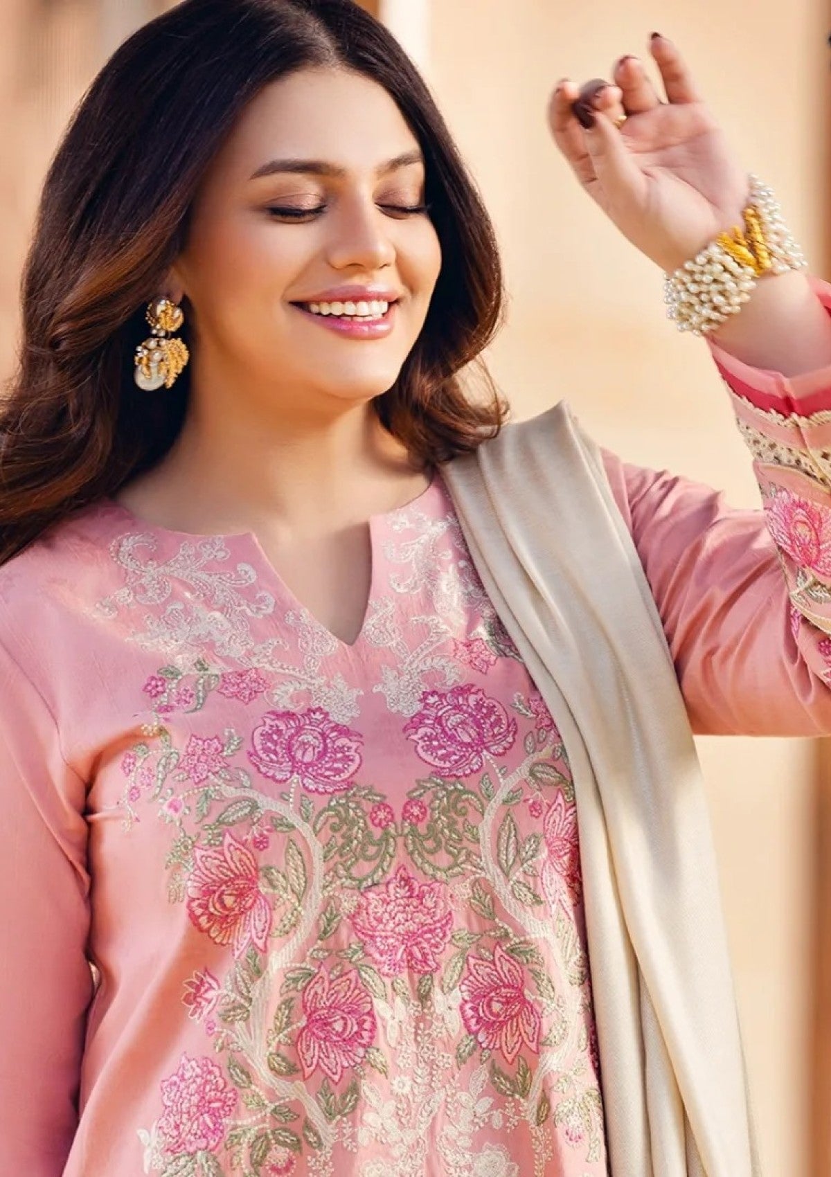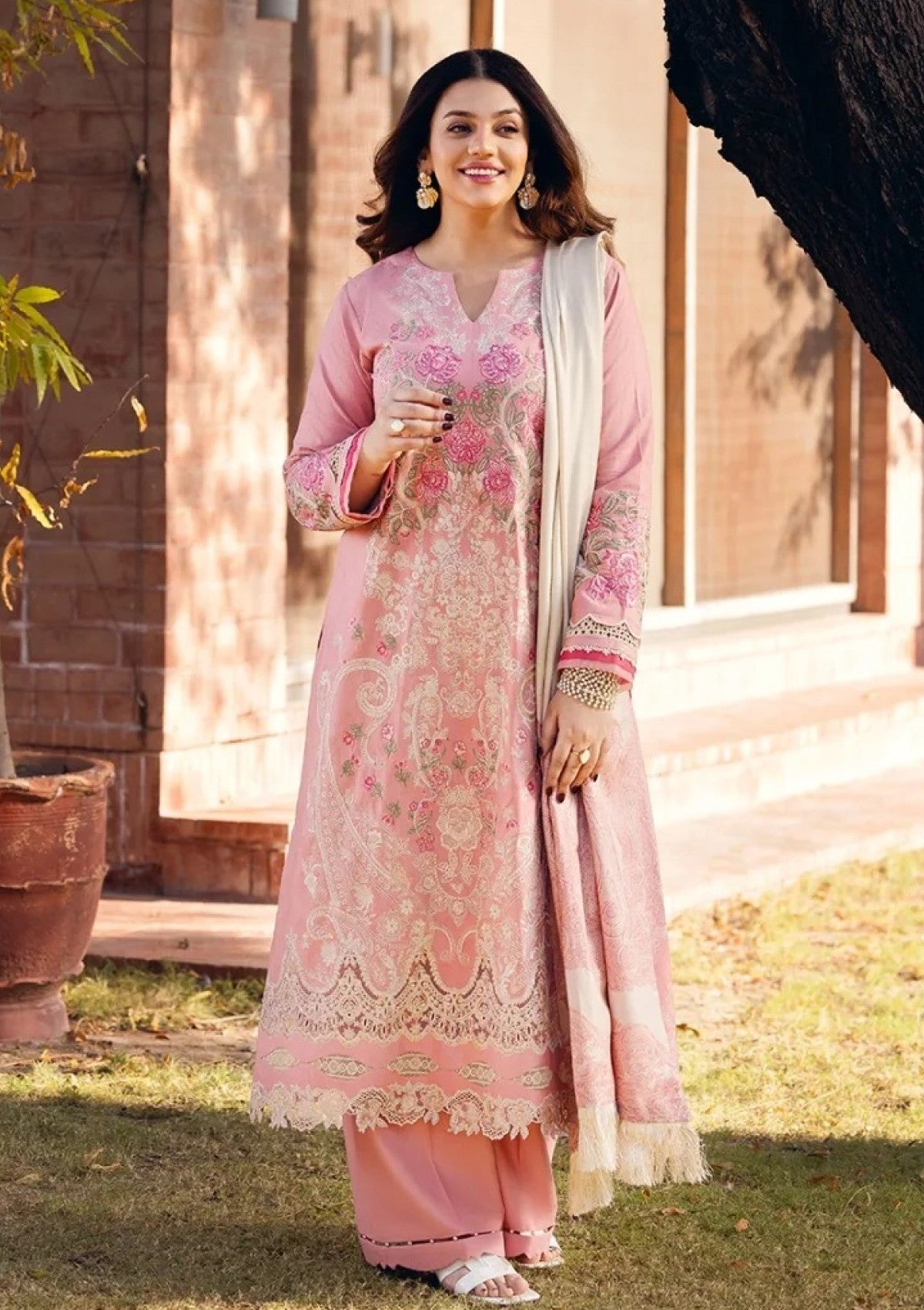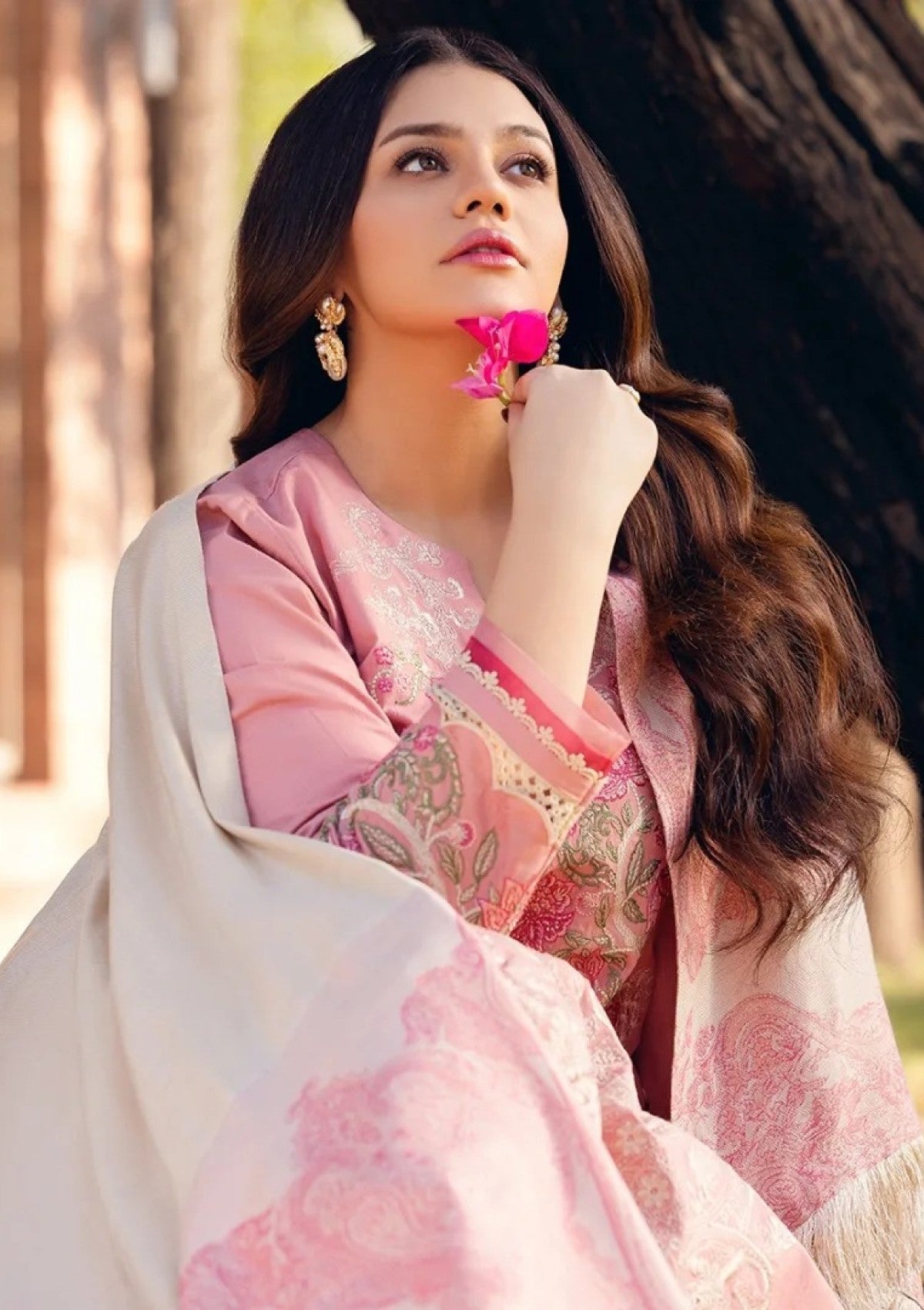 - Simple yet artistic, Guluna is a 3-piece unstitched ensemble in a soft pink hue on a twill linen canvas. The shirt showcases delicate resham embroidery in shades of pink and nude, finished with cutwork lace borders. It comes with a solid trouser and a pashmina hand-feel custom-woven jacquard shawl, designed to create an ever-gorgeous outlook.