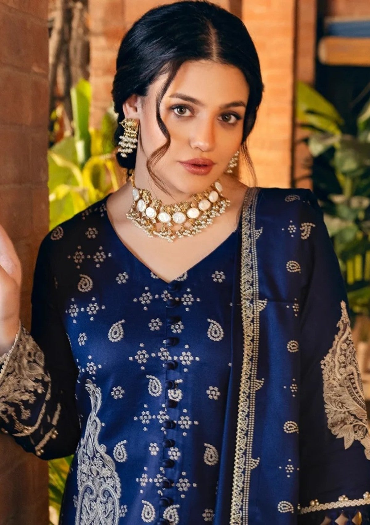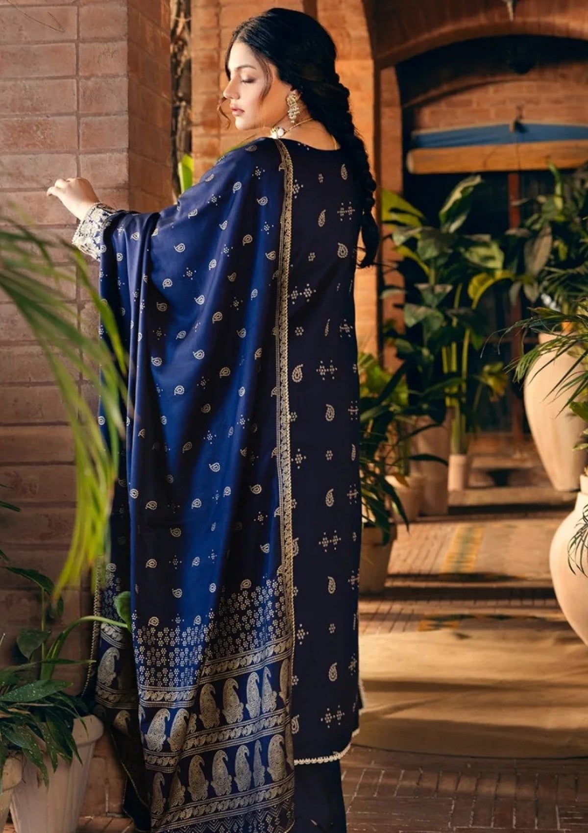 - Oplence in every detail, Aari is a 3-piece unstitched ensemble on a navy blue twill linen base. Featuring a panelled shirt and embroidered sleeves adorned with exquisite aari work, it is paired with a gold foil screen-printed shawl with chunri pattern and a plain trouser, crafting it as a tribute to the timeless artistry of unique resham techniques.