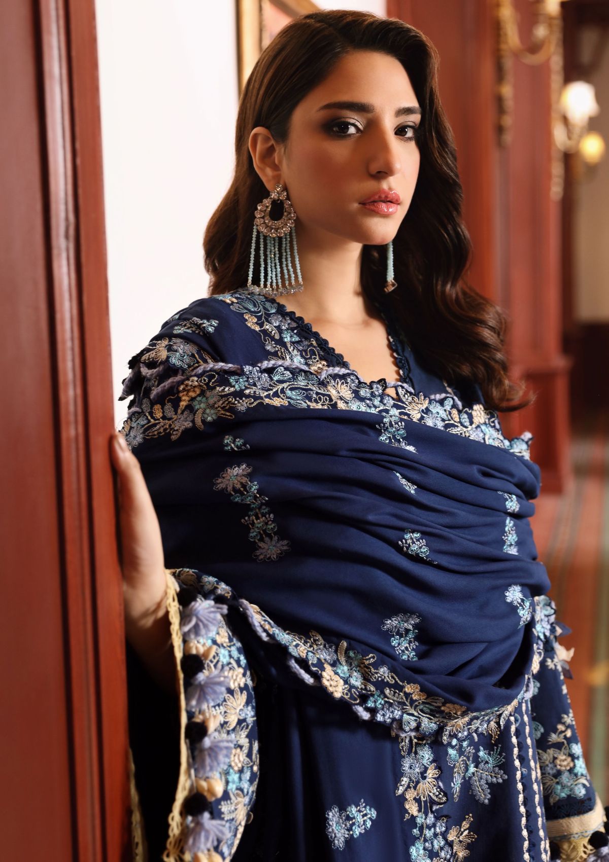 Description:A three panelled blue shirt unfolds, decked in resplendent allure and graced by the presence of intricate floral motifs engraved onto a radiant tapestry of mustard khaddar. Masterpiece unfolds, adorned with the artistry of satin stitches with intricate floral multi mono tone embroidery with acrylic shawl, elevated to extraordinary heights by a daring and swirling four sided floral embroidery adorned with vivid hues.