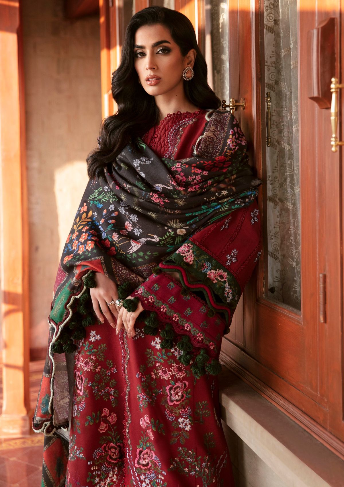 A luxuriously crafted piece of karandi fabric, resplendent in a creamy white hue, showcases exquisite floral embroidery that unfolds in a harmonious symphony of reds, pinks, lime, and feroza shades. The printed floral pashmina, a testament to refined design, exhibits a masterful play of color blocking, enhancing its visual allure. This opulent textile represents a fusion of traditional craftsmanship and contemporary aesthetics, making it a captivating and timeless creation.