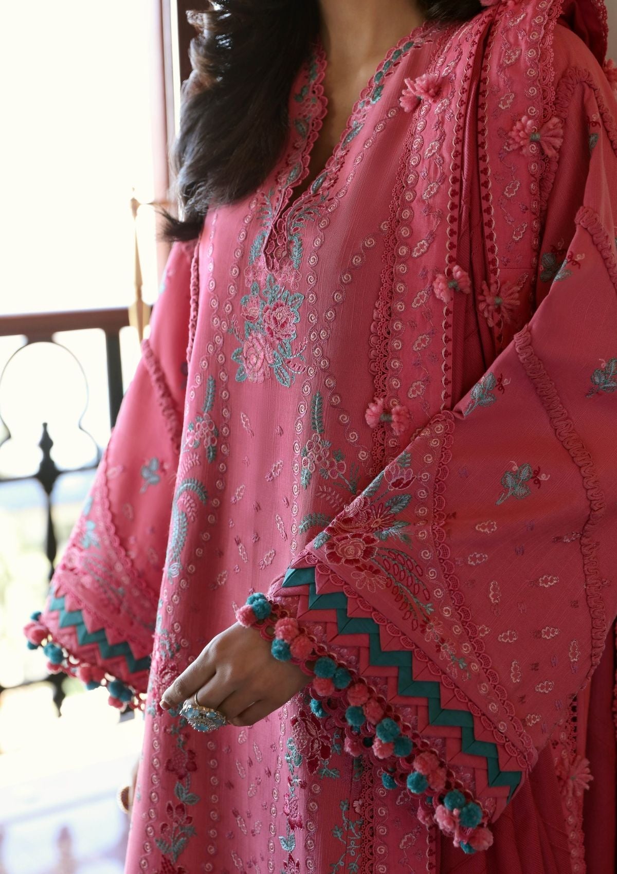 Captivating and extraordinary, this elegant CORAL PINK ensemble showcases intricate craftsmanship, meticulous geometric and delicate floral arrangements, and precise stem stitches in a thoughtfully designed structural layout. It is complemented by a contrasting TEA PINK pashmina shawl featuring four-sided borders and arches on both sides, adding an extra layer of sophistication to the overall ensemble.
