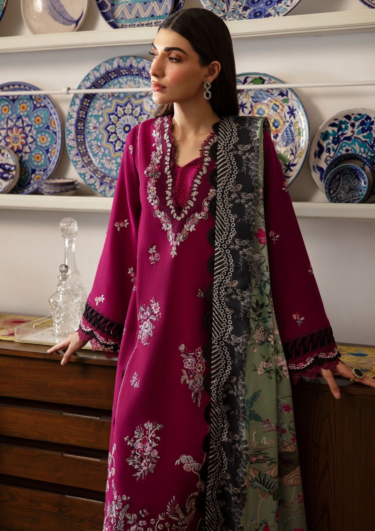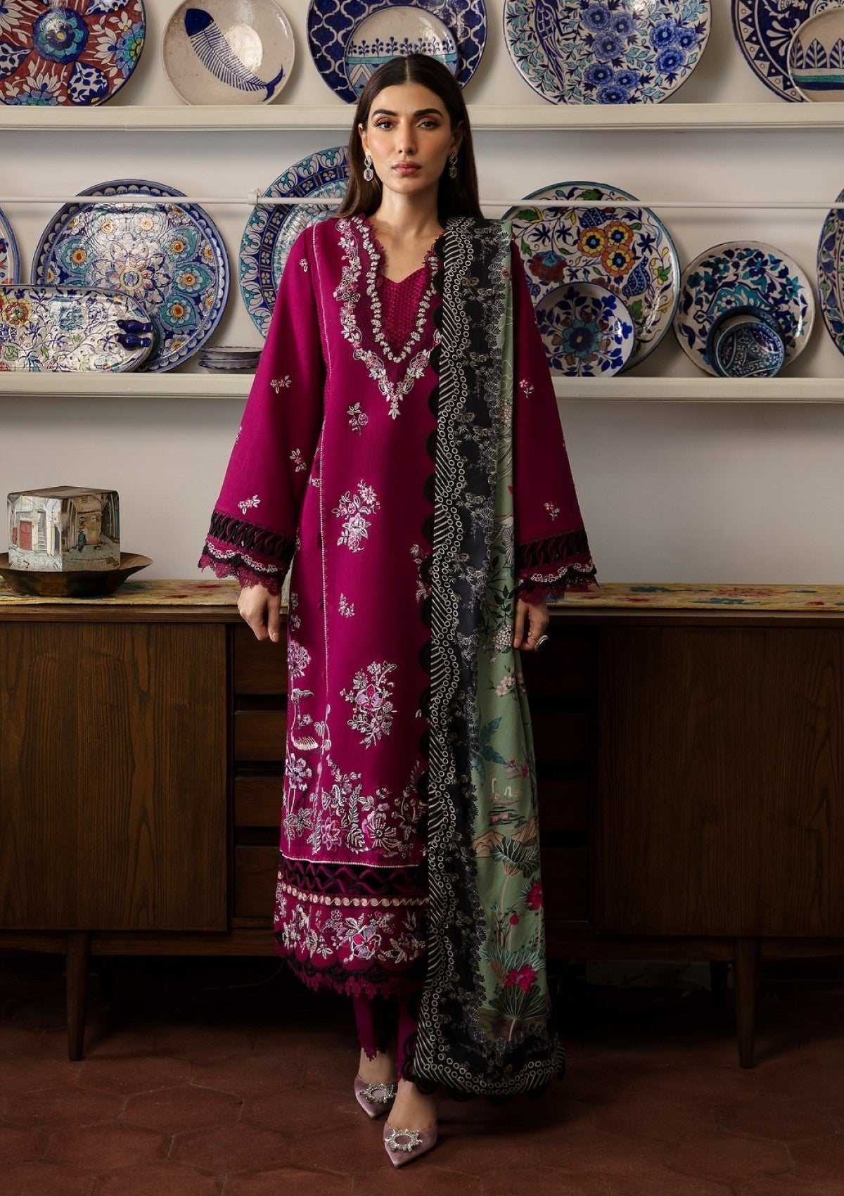 A magnificent deep fuchsia canvas emerges, adorned with botanical florals and tribal elements rendered in enchanting black tones, accented by bright splashes of berry, rogue, mauve pink, and black. Drawing inspiration from rich ethnic cultures and design philosophies, it features a border intricately layered with multicolored thread work, creating a captivating composition. Accompanied by a luxurious Viscose shawl that bursts with a stunning array of colors and imagery, this vibrant ensemble is sure to make a striking statement this winter.