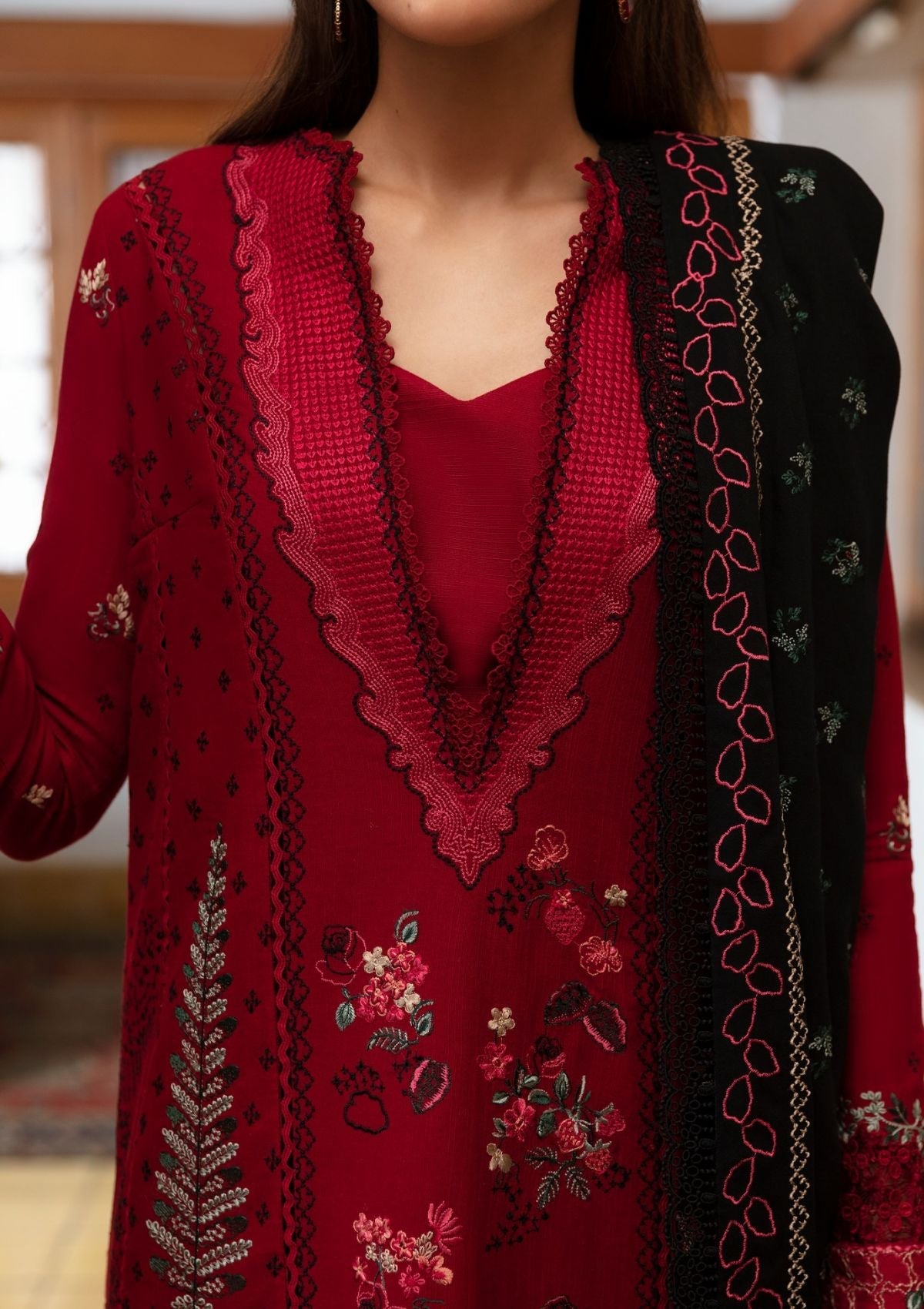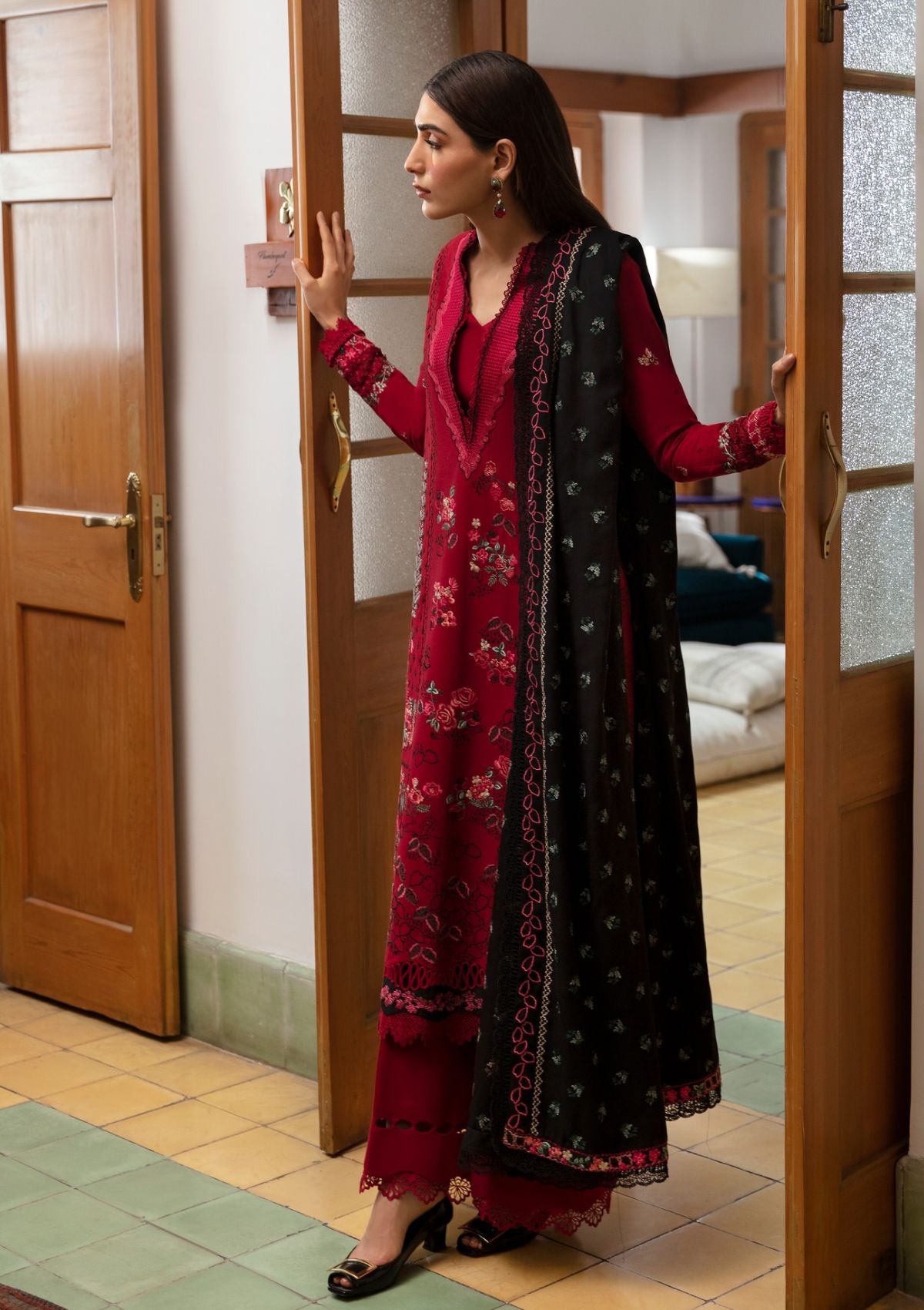 Woven from premium khaddar fabric, this exquisite three-paneled shirt is a testament to craftsmanship, adorned with vibrant floral clusters, delicate leaves, and graceful swirling vines, all brought to life with intricate black embroidery. A bold black floral border with coral hues adds dimension, enriched by smooth satin stitching for a polished finish. The ensemble is elevated by a black acrylic shawl, showcasing a rich blend of coral and rust hues, accented with leafy motifs that infuse the design with timeless elegance and charm.