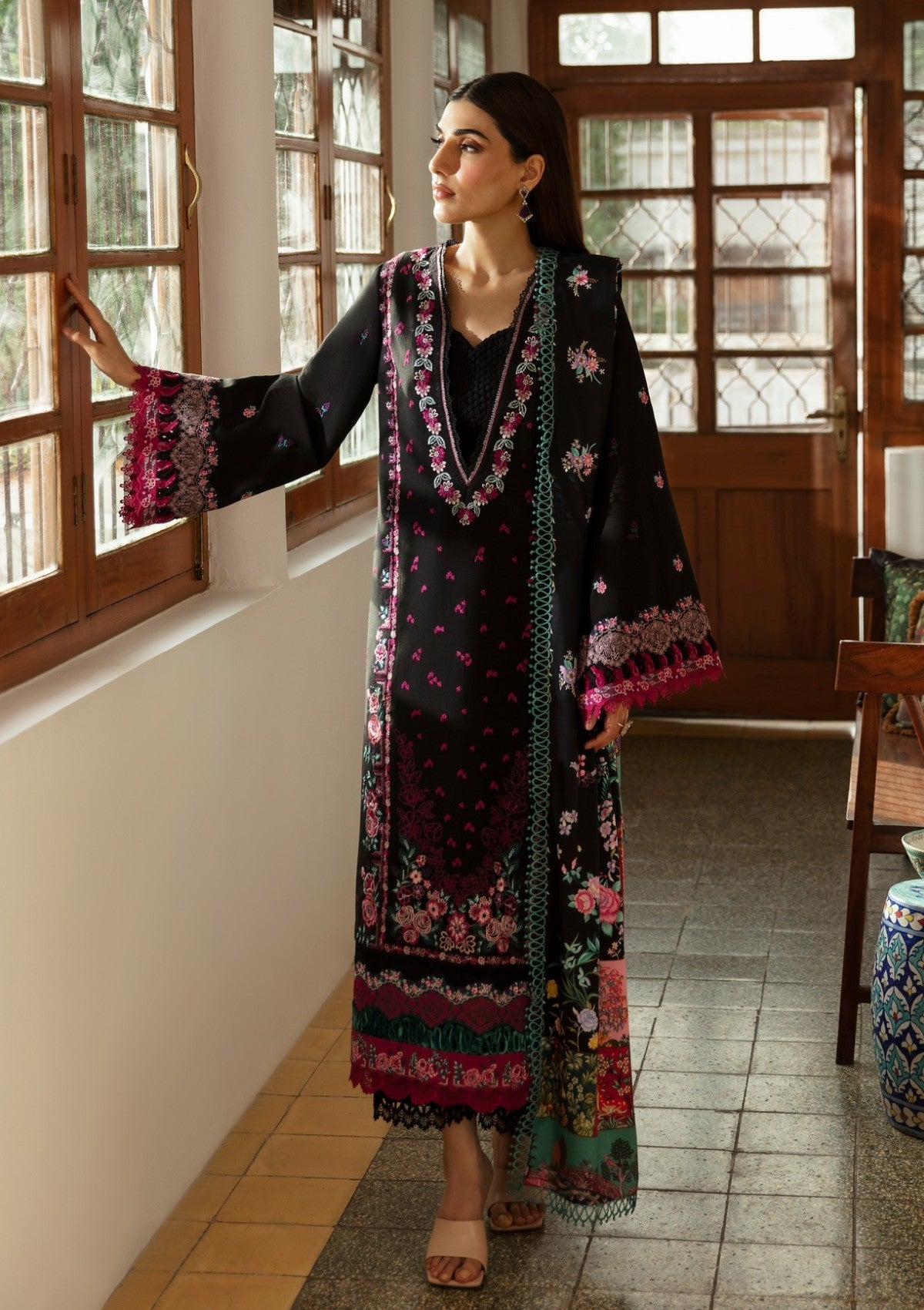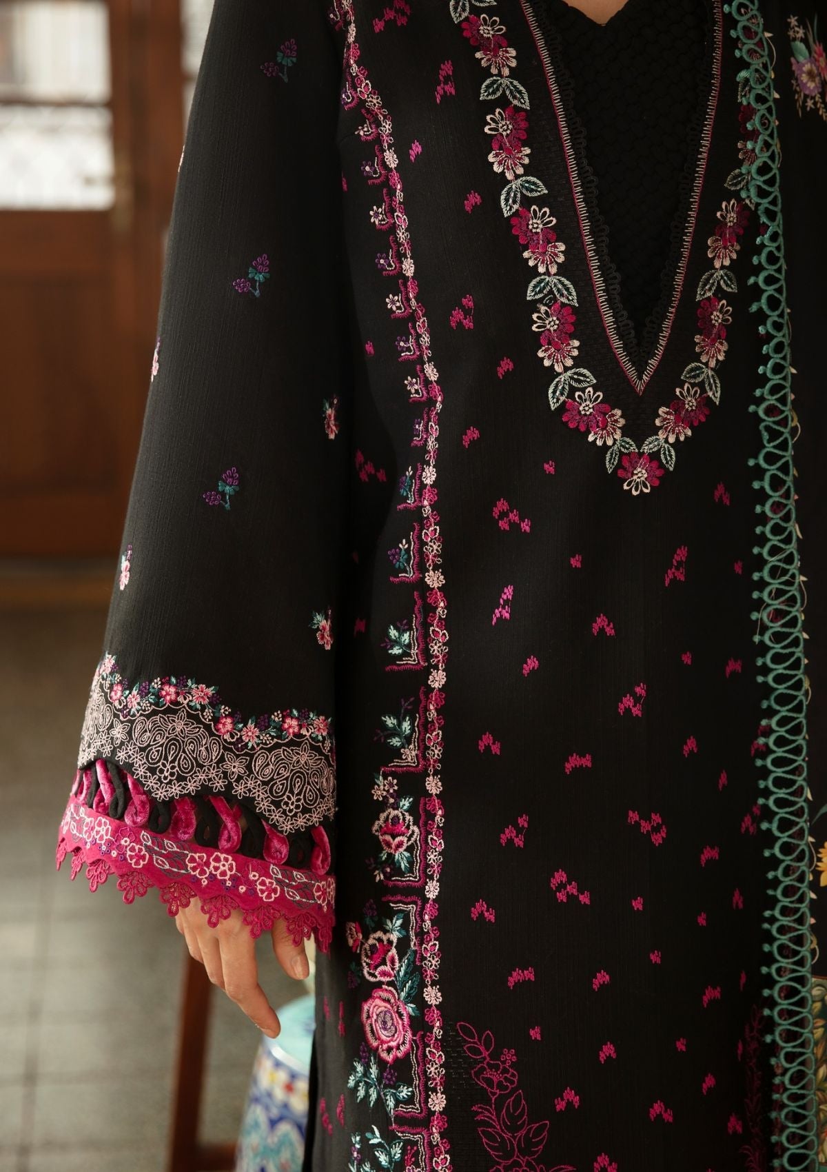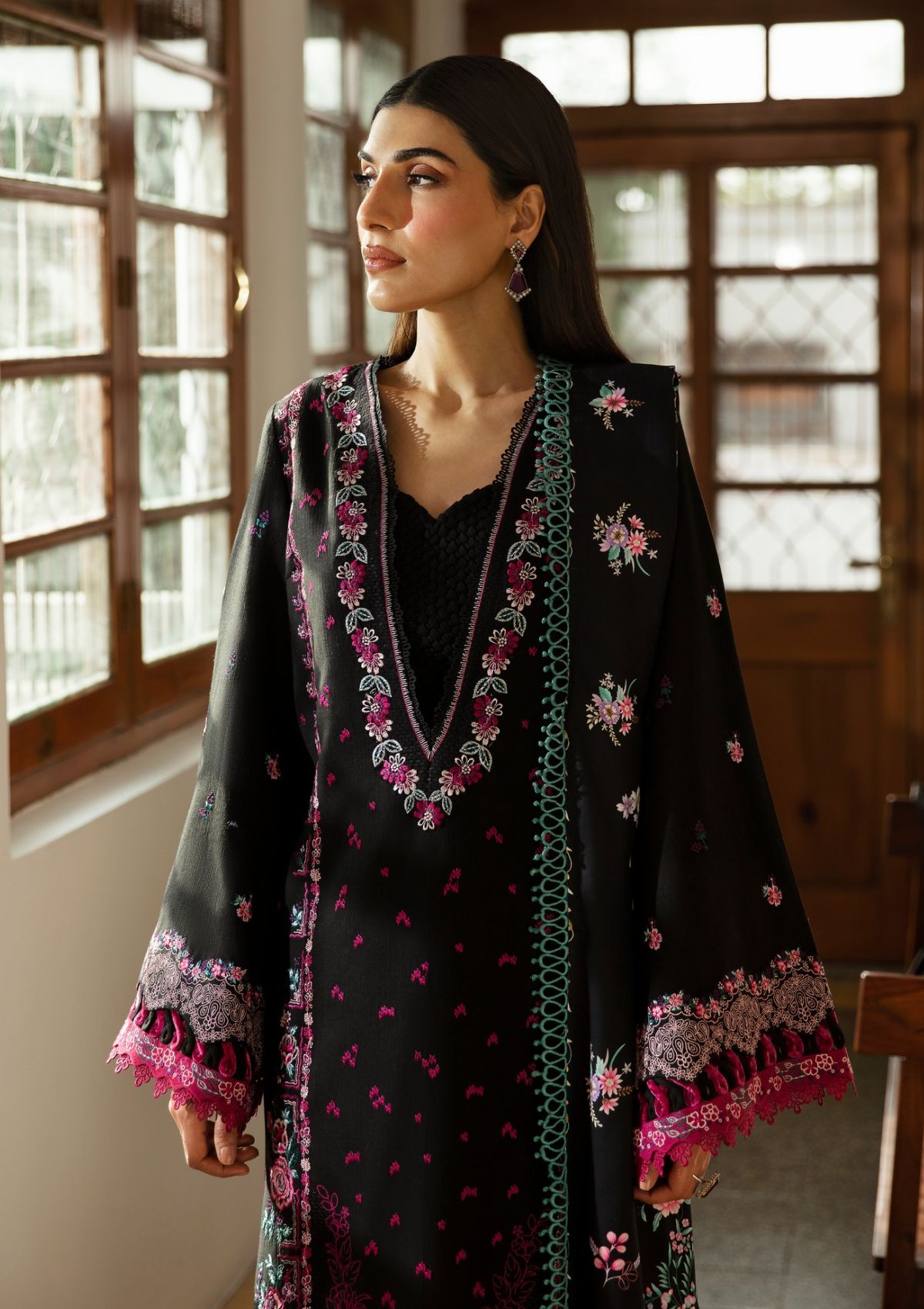 A symphony of blossoms and delicate leaves creates a captivating display on a rich black khaddar canvas. Intricate Tanka embroidery comes to life in soft shades of pink, lilac, sea foam, sage, and teal, forming a masterpiece of fine detail. The ensemble is perfectly complemented by a lavishly illustrated shawl, adorned with artistic prints in a spectrum of vibrant hues. Designed with ultra-feminine touches, elevated textures, and luxurious accents, this look offers an effortless blend of grace and comfort, allowing you to glide through the winter season with unmatched ease and sophistication.