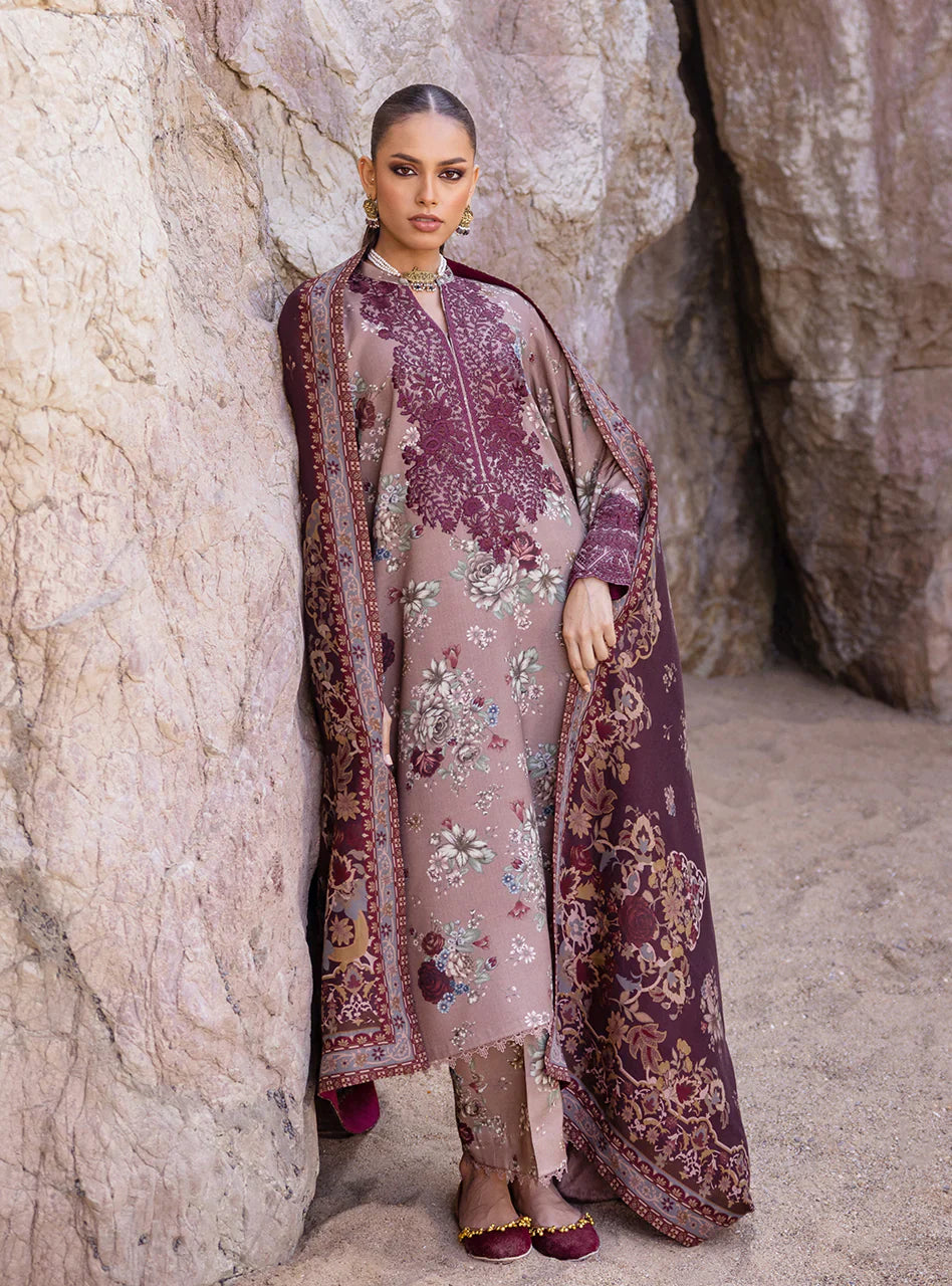 Floral printed co-ord set is appealing with its intricately embroidered neckline and sleeves. To further enhance this look a deep maroon printed shawl with bold borders and floral prints is added. This winter showcase your impeccable taste in fashion with Aks.