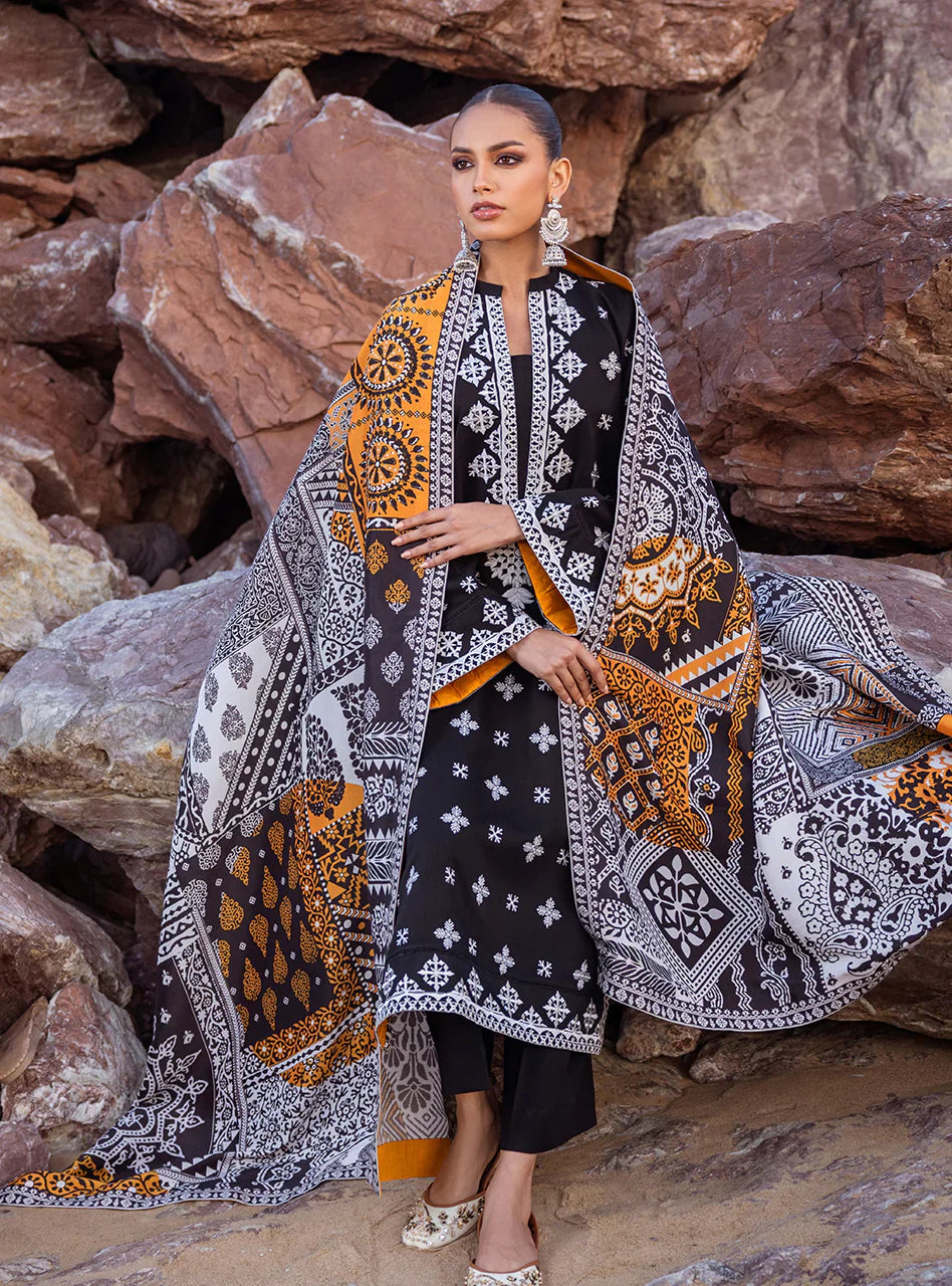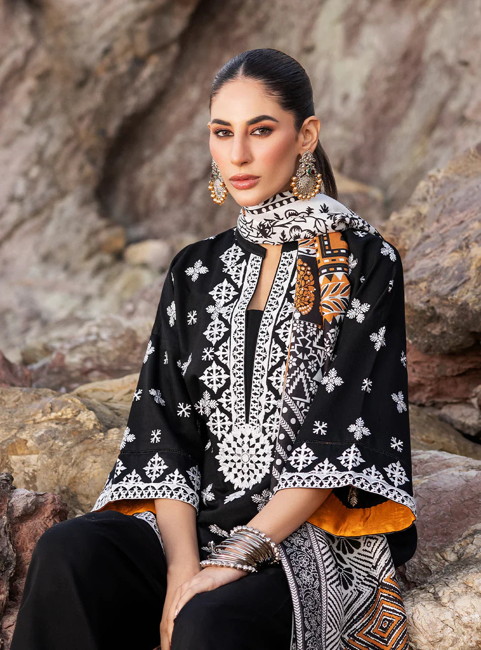 Step into the enchanting world of winter elegance with this exquisitely embroidered outfit adorned with a luxurious winter shawl. The embroidered neckline enhances the look along with a complimenting shawl that is highlighted with a pop of mustard. The collage shawl adds life to the embroidered front with solid pants.