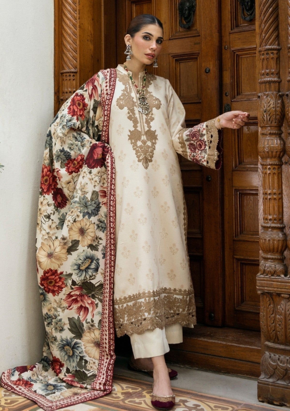 The ivory shirt is adorned with exquisite beige embroidery on the neckline, adding a touch of sophistication. The sleeves and hemline are delicately embellished with a harmonious blend of beige and maroon floral detailing, creating a soft yet striking design. This outfit is paired with a stunning shawl that showcases an intricate maroon, grey, beige, and ivory floral pattern, adding an air of luxurious charm to your attire. Completing the look is a matching pant, ensuring a cohesive and polished appearance.